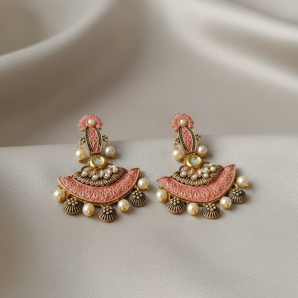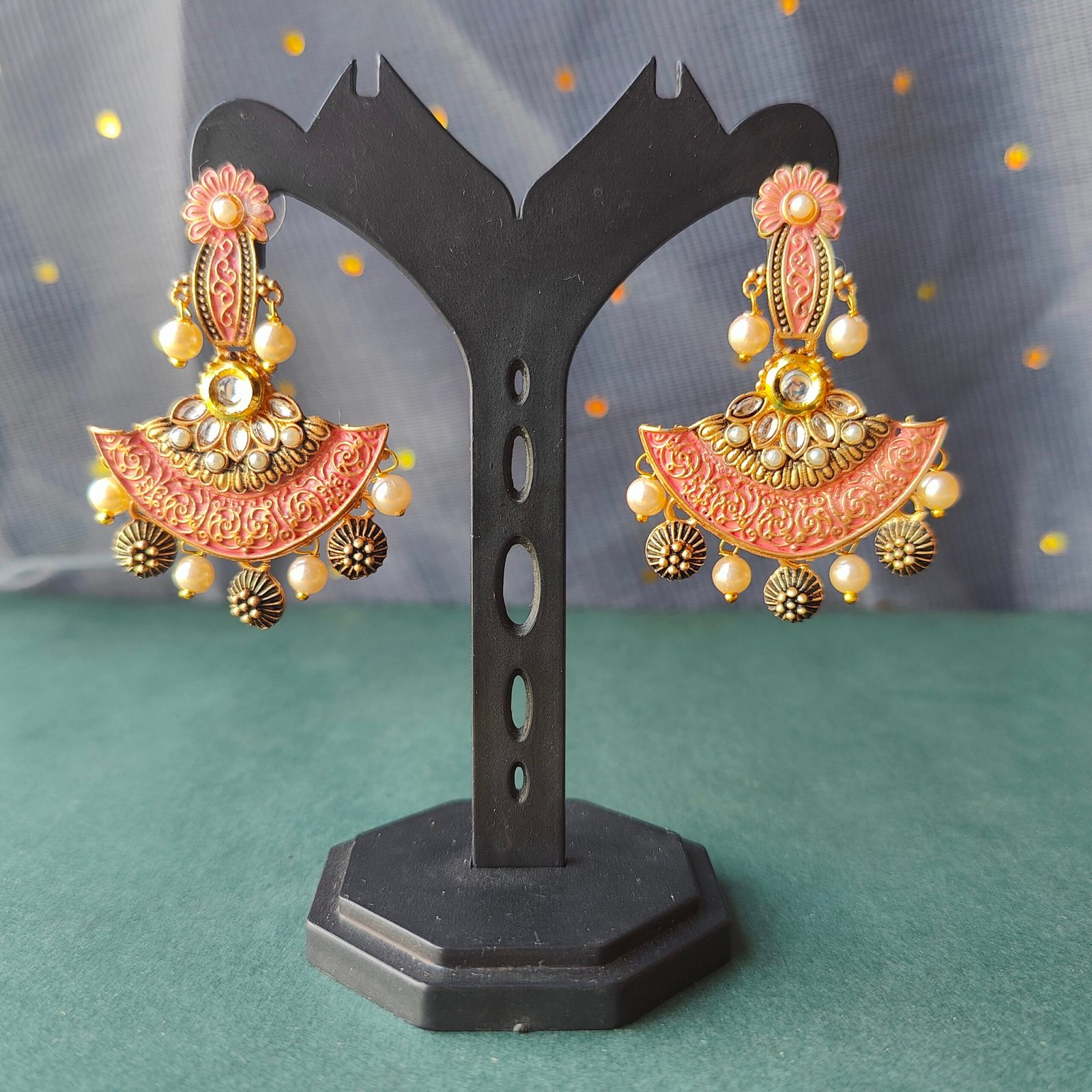 Antique Gold Enamel Chandbali Earrings with Pearl & Coin Danglers