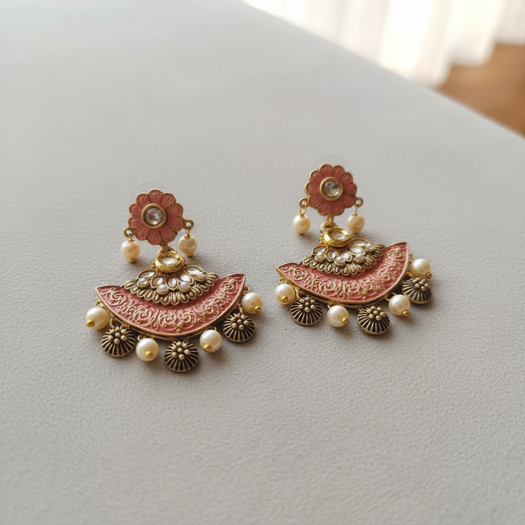 Step into timeless elegance with these exquisitely crafted antique gold chandbali earrings, inspired by classic Indian heritage jewellery. Featuring rich red enamel work with intricate detailing, these earrings are beautifully highlighted with a central stone and floral motifs at the top. The crescent-shaped design is adorned with delicate pearl drops and antique-finish coin danglers that add graceful movement and traditional charm. Perfect for weddings, festive celebrations, and special occasions, these statement earrings elevate ethnic ensembles with royal sophistication.