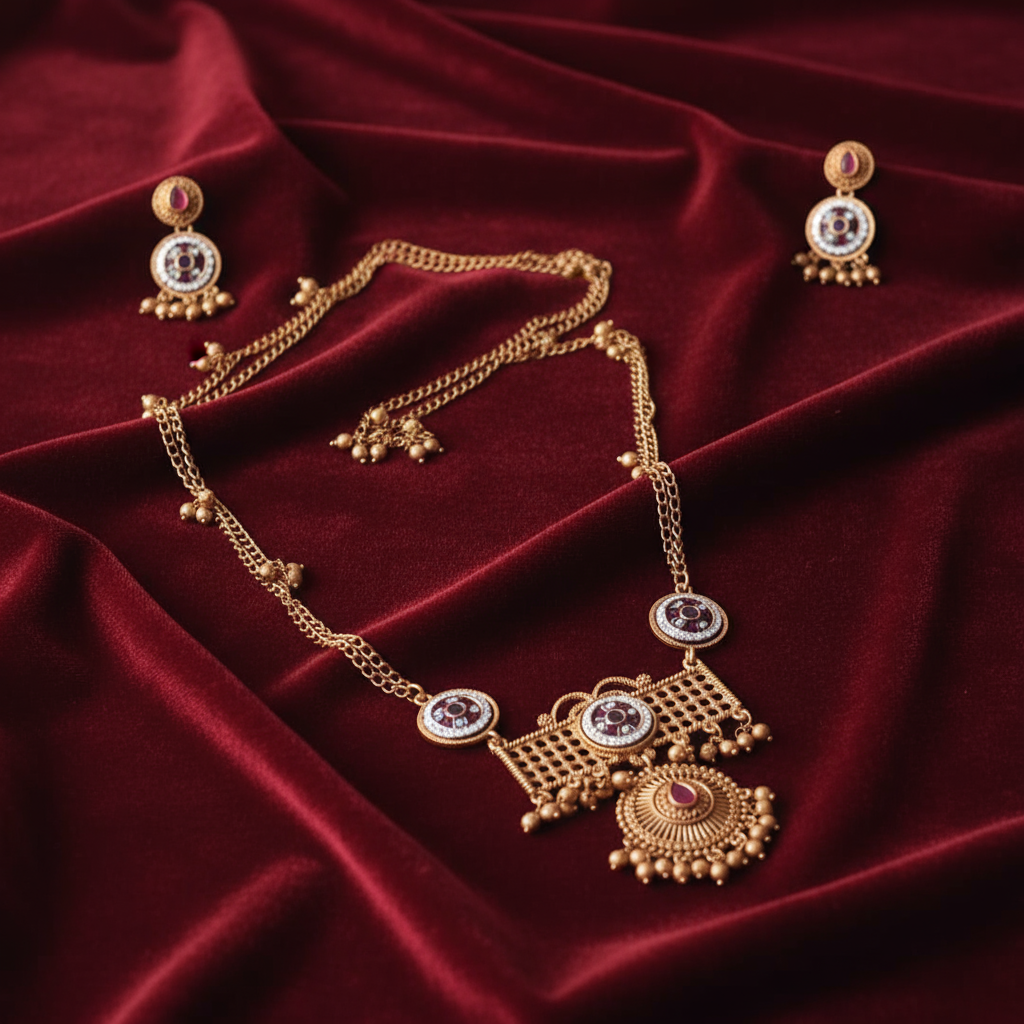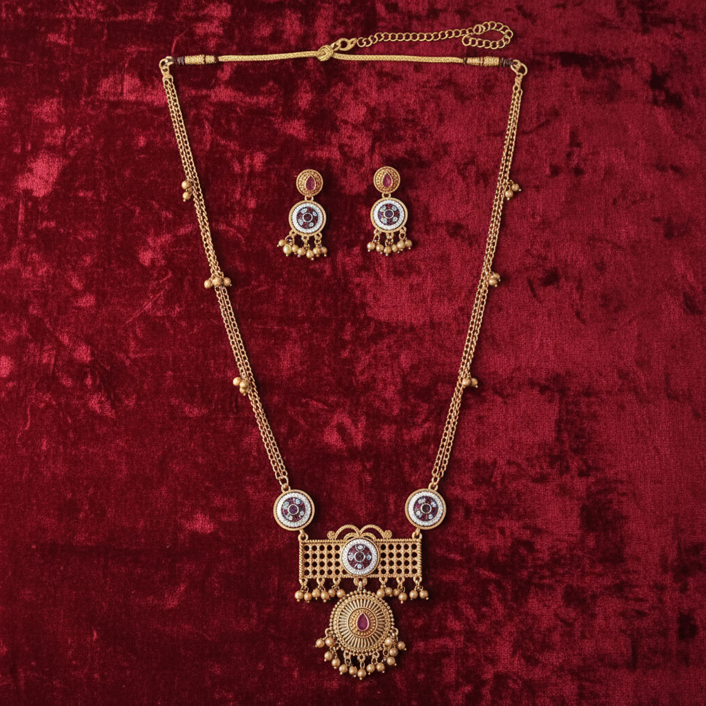 Add a touch of regal elegance to your ethnic look with this beautifully crafted antique gold long necklace set. Designed with a graceful chain accented by delicate bead detailing, the necklace features striking circular ruby-tone medallions that lead to an intricately worked statement pendant. The pendant is highlighted with fine lattice detailing and finished with traditional ghungroo-style bead drops for added charm. Paired with matching earrings, this set is perfect for weddings, festive celebrations, and special occasions, effortlessly enhancing sarees, lehengas, and ethnic ensembles.