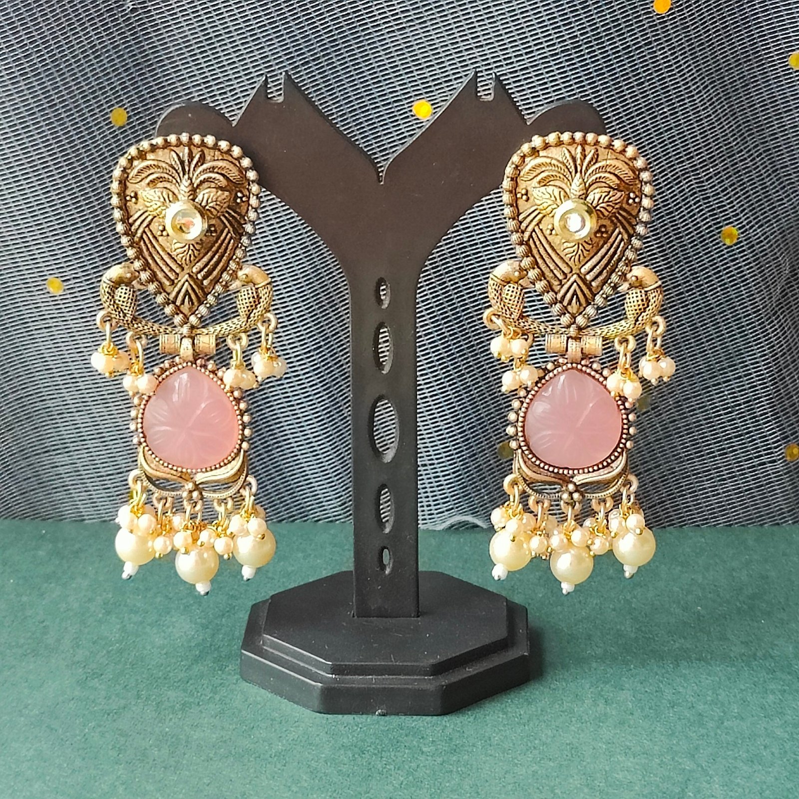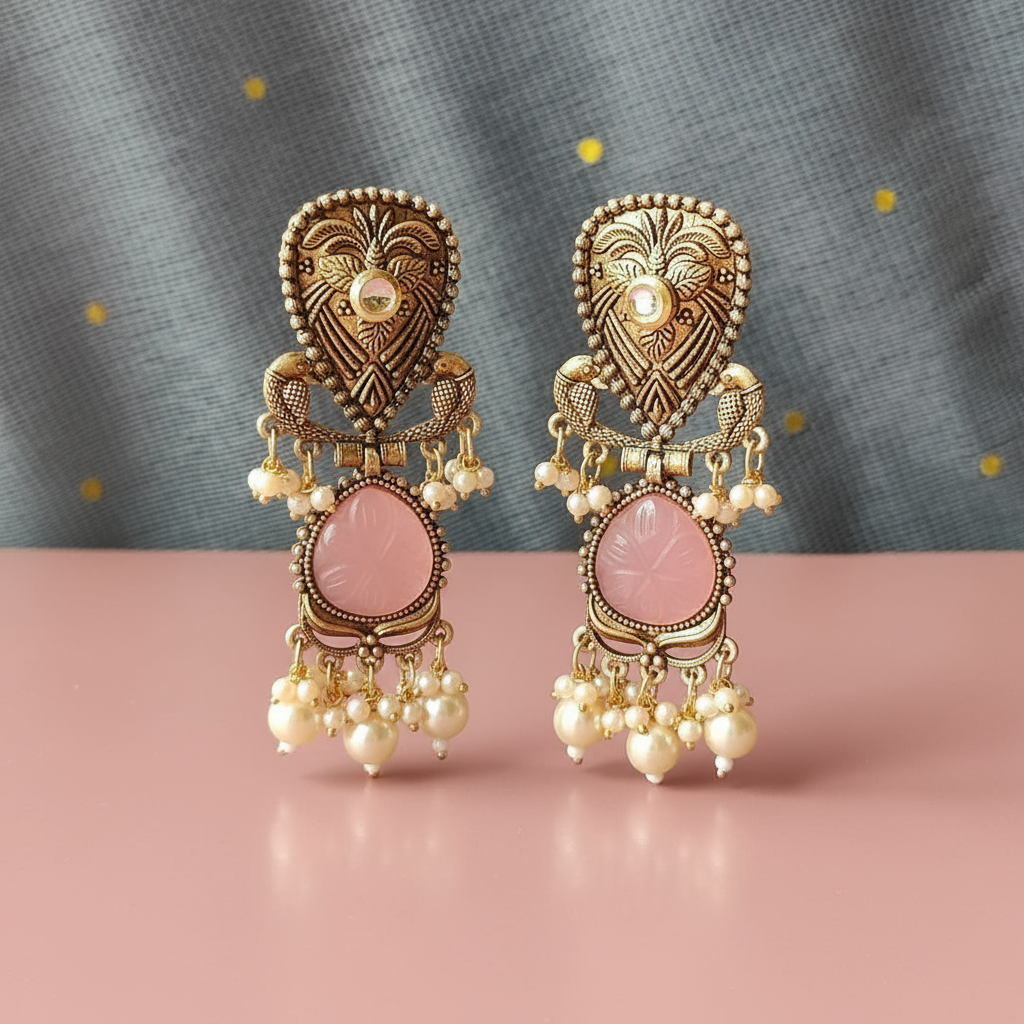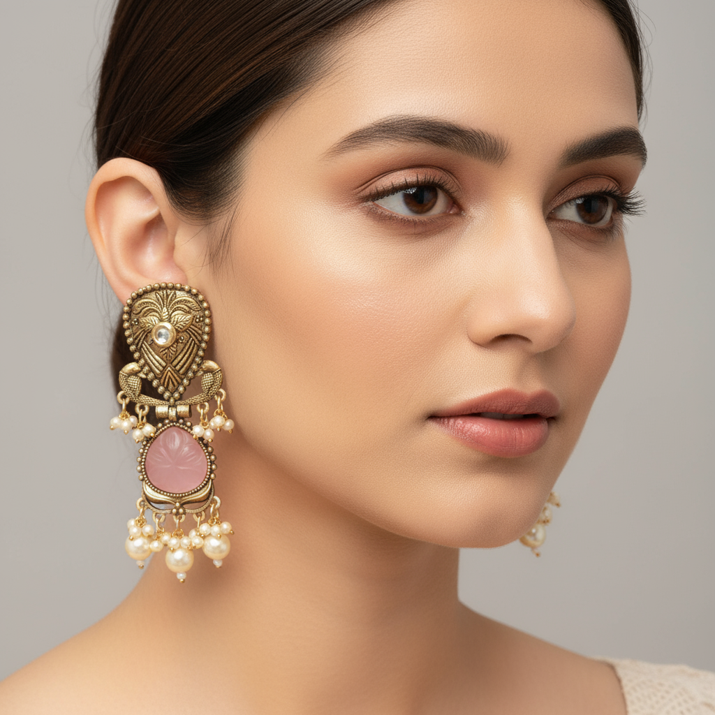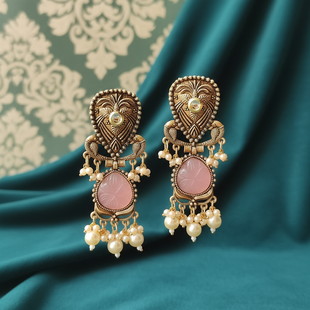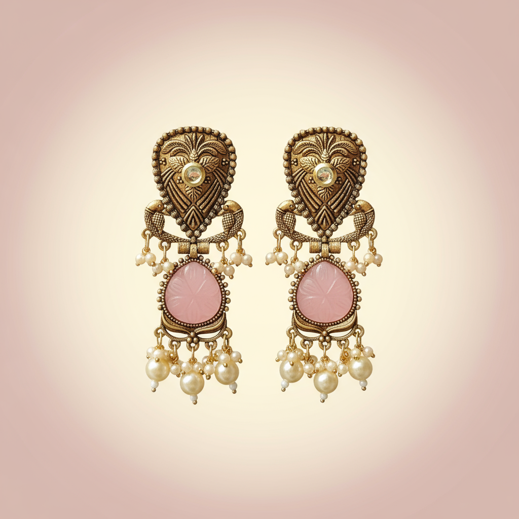 Be the first to review “Antique Gold Peacock-Inspired Light Pink Stone Pearl Drop Statement Earrings”