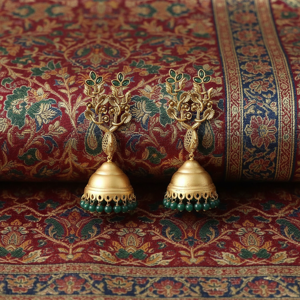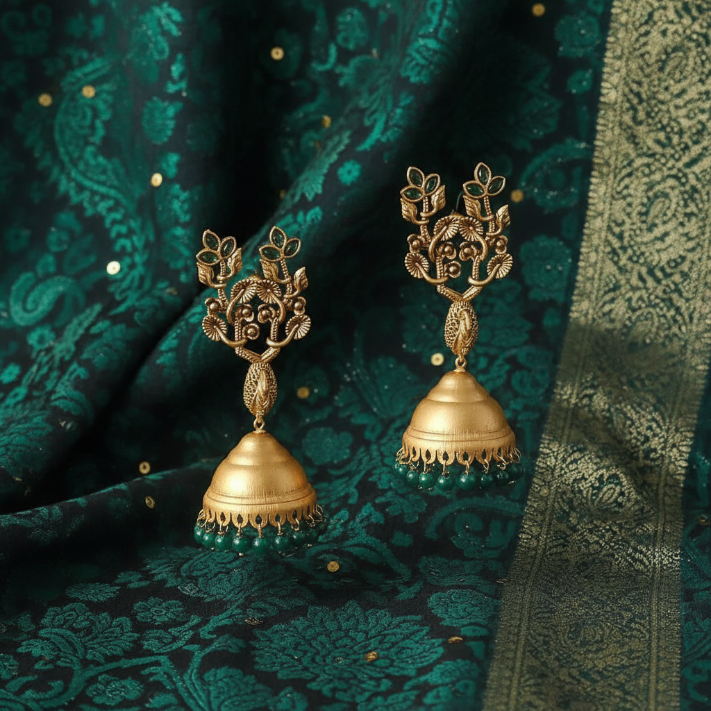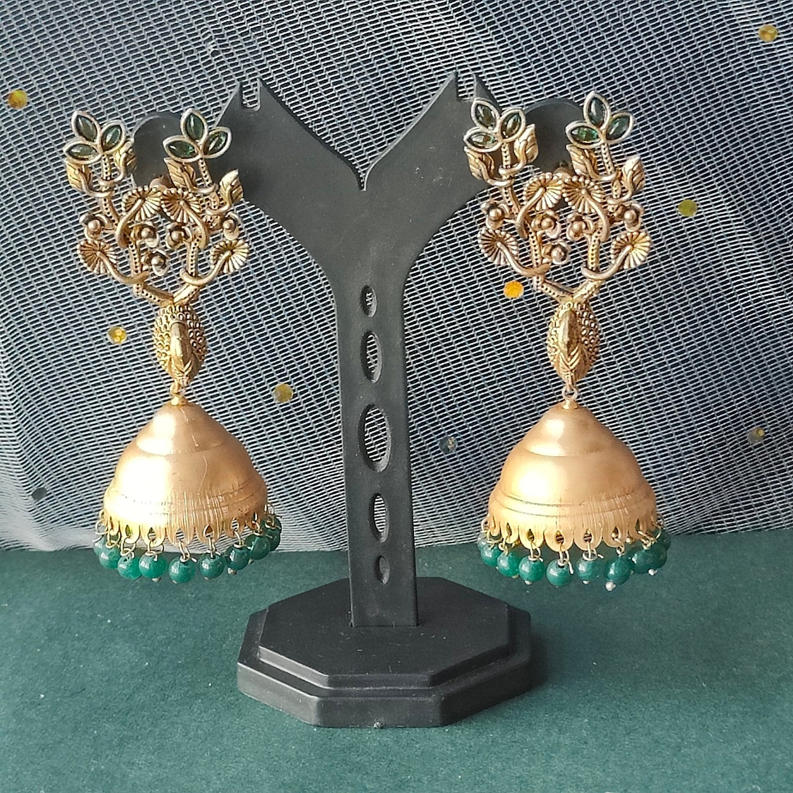 Elevate your ethnic charm with these exquisite antique gold jhumka earrings, meticulously crafted to perfection. The earrings feature an elegant floral and leaf motif studded with emerald-green stones, seamlessly blending traditional artistry with a regal touch. The dome-shaped matte gold jhumka is adorned with a fringe of green beads, adding depth and sophistication to the overall design.