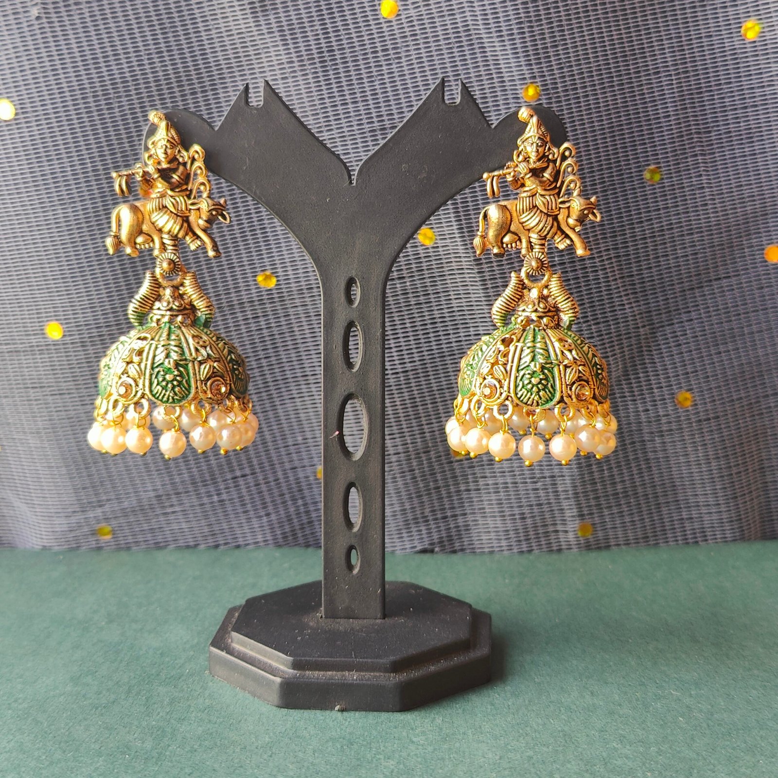 Antique Gold Temple Jhumka Earrings with Goddess Motif & Pearl Drops (Copy)