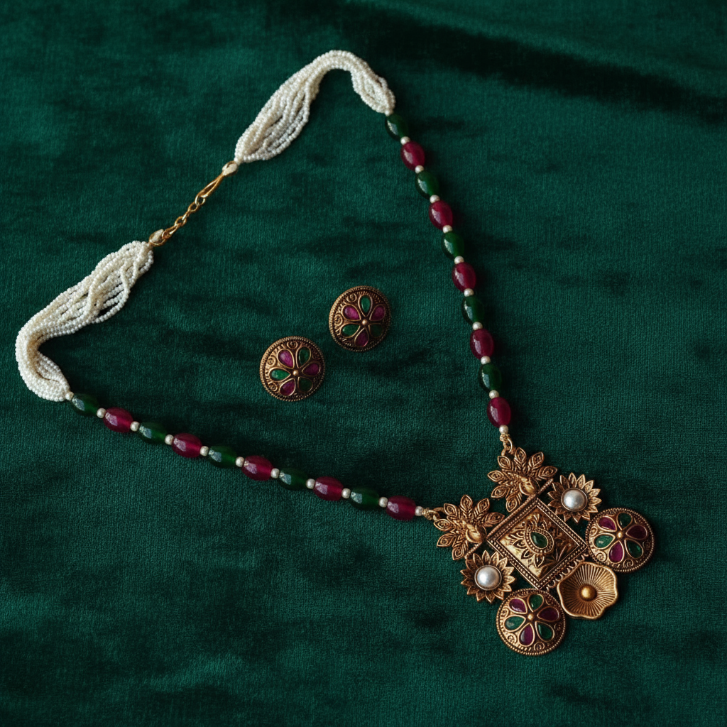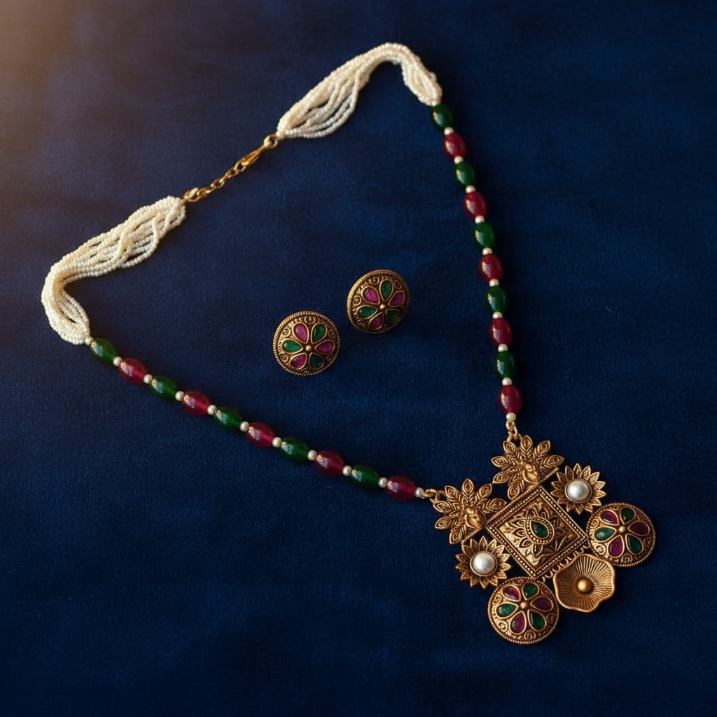 Antique Gold Temple Necklace Set with Ruby-Green Beads & Enamel Pendant
