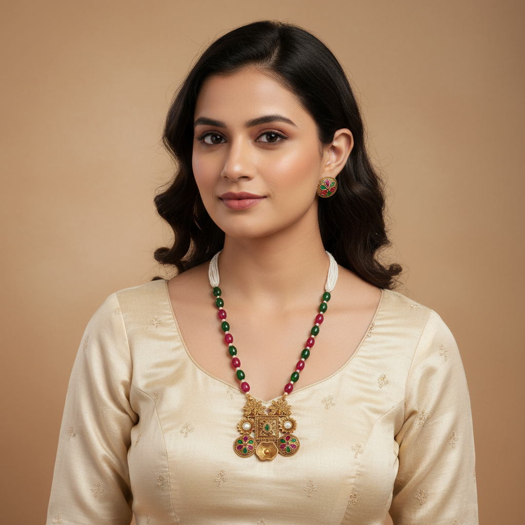 Celebrate traditional elegance with this exquisitely crafted antique gold temple necklace set, designed to reflect timeless South Indian artistry. The necklace features a harmonious blend of ruby and green beads, complemented by strands of delicate white seed pearls that add a graceful touch. The highlight is the intricately detailed square enamel pendant adorned with floral motifs and pearl accents, exuding regal charm. Paired with matching stud earrings, this set is perfect for weddings, festive occasions, poojas, and heritage celebrations, beautifully enhancing sarees and ethnic ensembles.