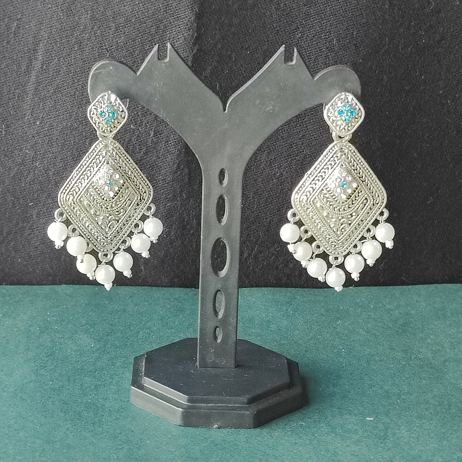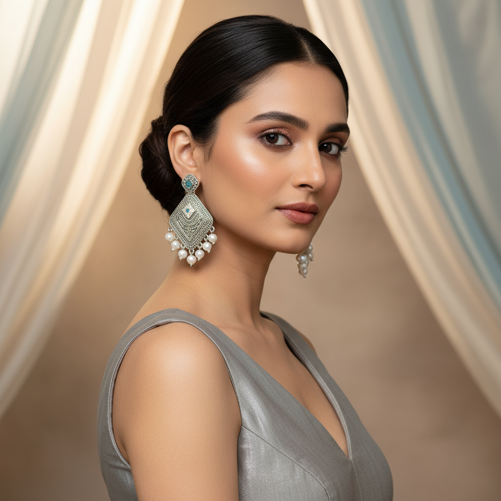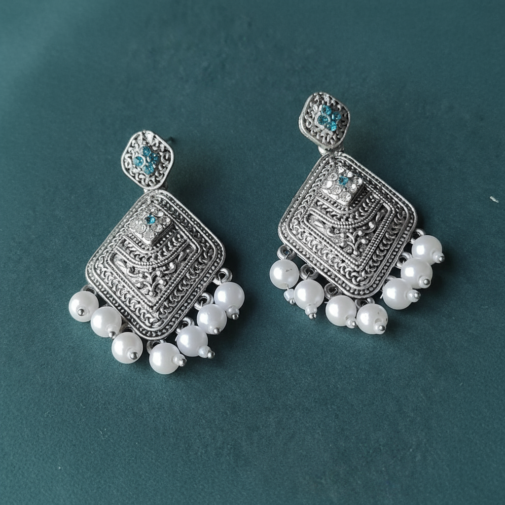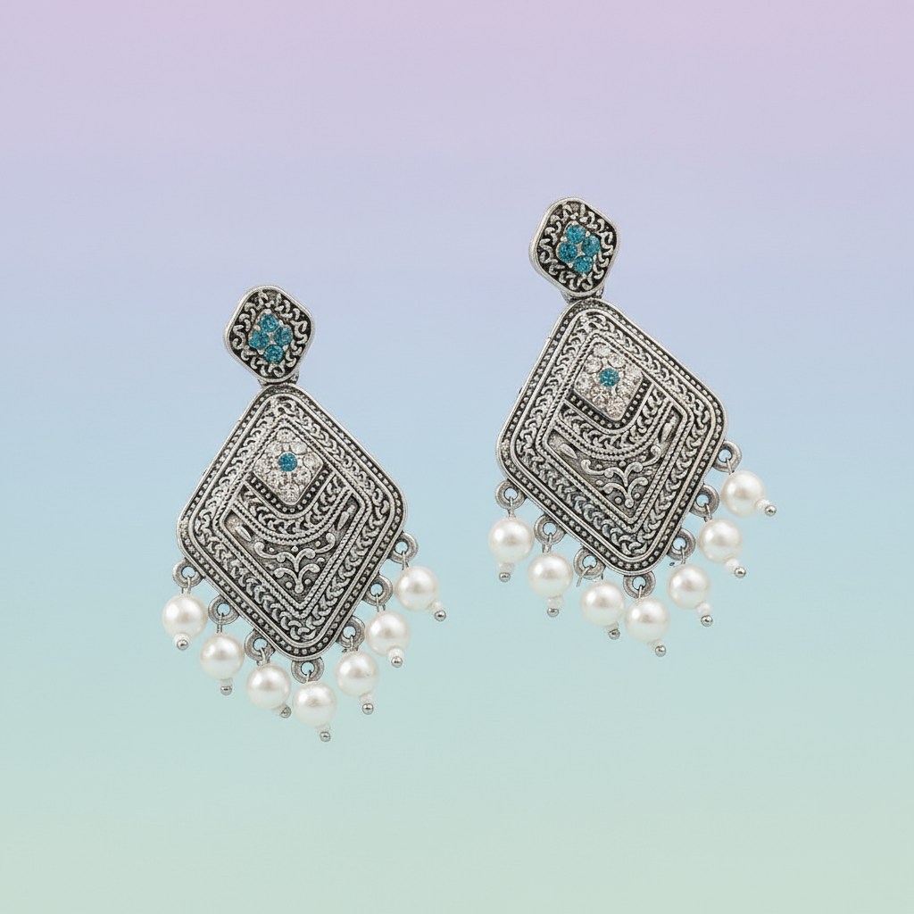 Elevate your ethnic and fusion looks with these exquisite antique silver-plated statement earrings. Featuring intricate geometric patterns accented by stunning blue stones, each earring is adorned with elegant white pearl drops along the edge. Lightweight and carefully crafted, these earrings are perfect for festive occasions, weddings, or making a stylish statement at any event. Pair them with sarees, lehengas, or modern outfits for a chic and timeless appeal.