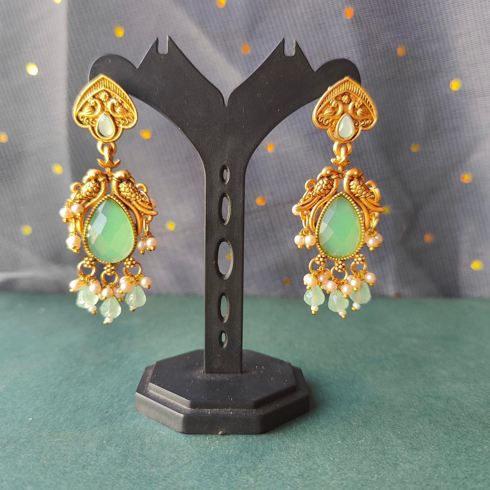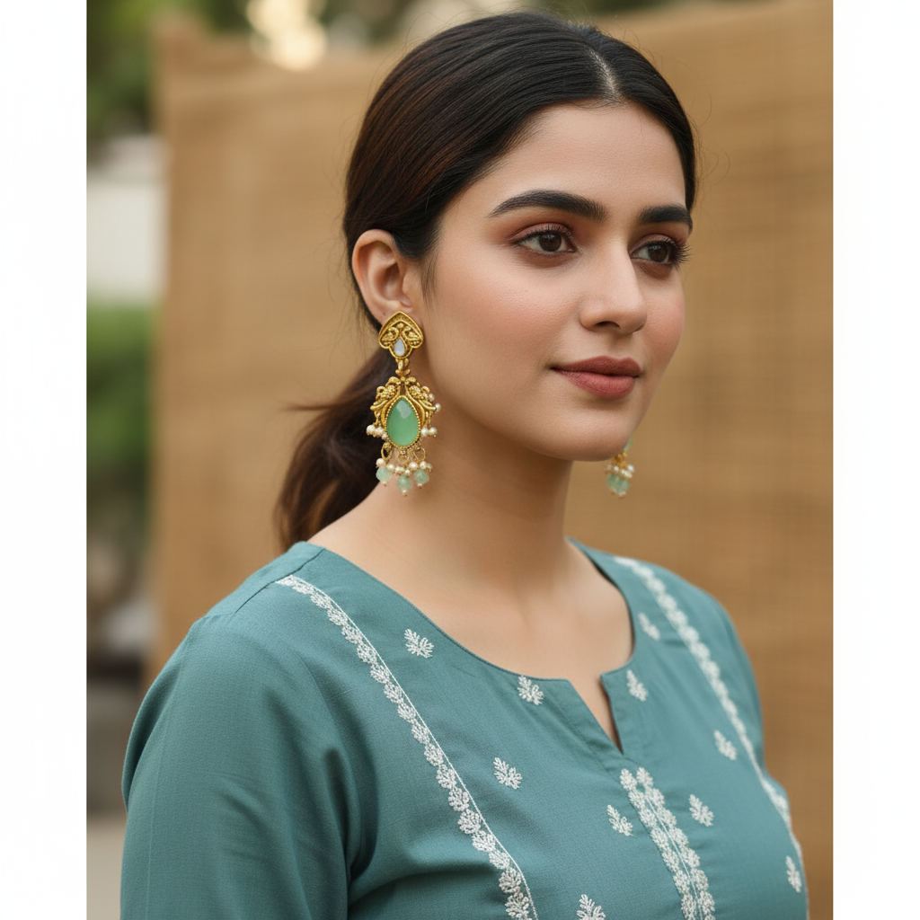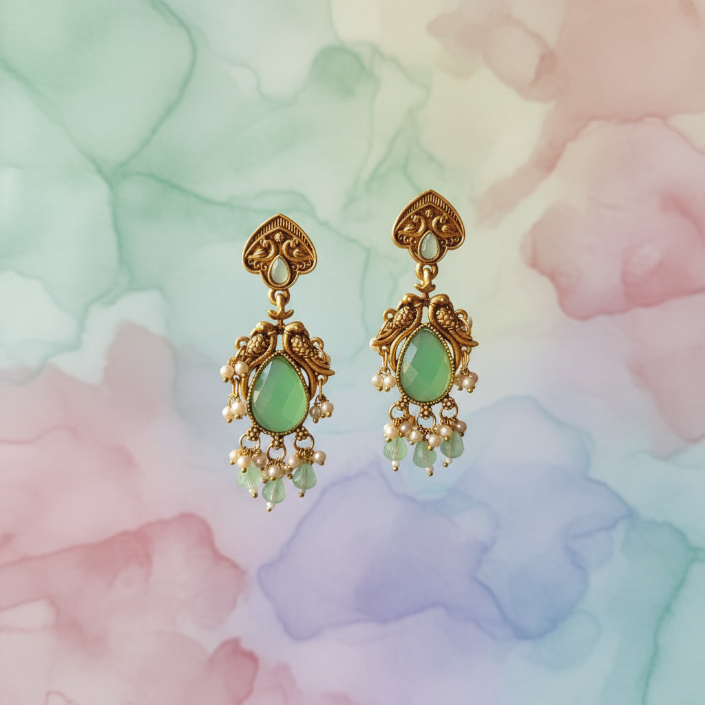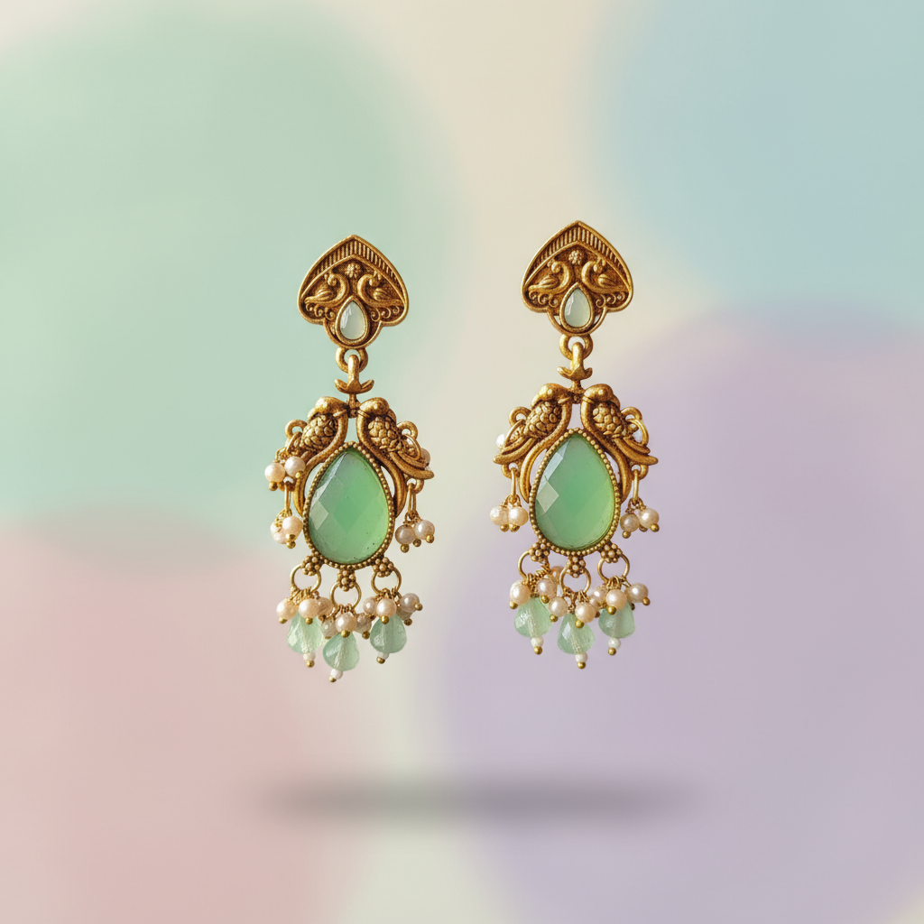 Elevate your ethnic and festive look with these exquisitely crafted antique gold chandelier earrings. Designed with intricate peacock-inspired detailing, these earrings feature a soothing mint green teardrop stone at the center, beautifully complemented by delicate pearl and bead danglers. The rich antique finish adds a timeless charm, making them a perfect choice for weddings, festive occasions, and traditional celebrations. Lightweight yet statement-making, these earrings blend classic Indian craftsmanship with graceful elegance, ensuring they stand out with every outfit.