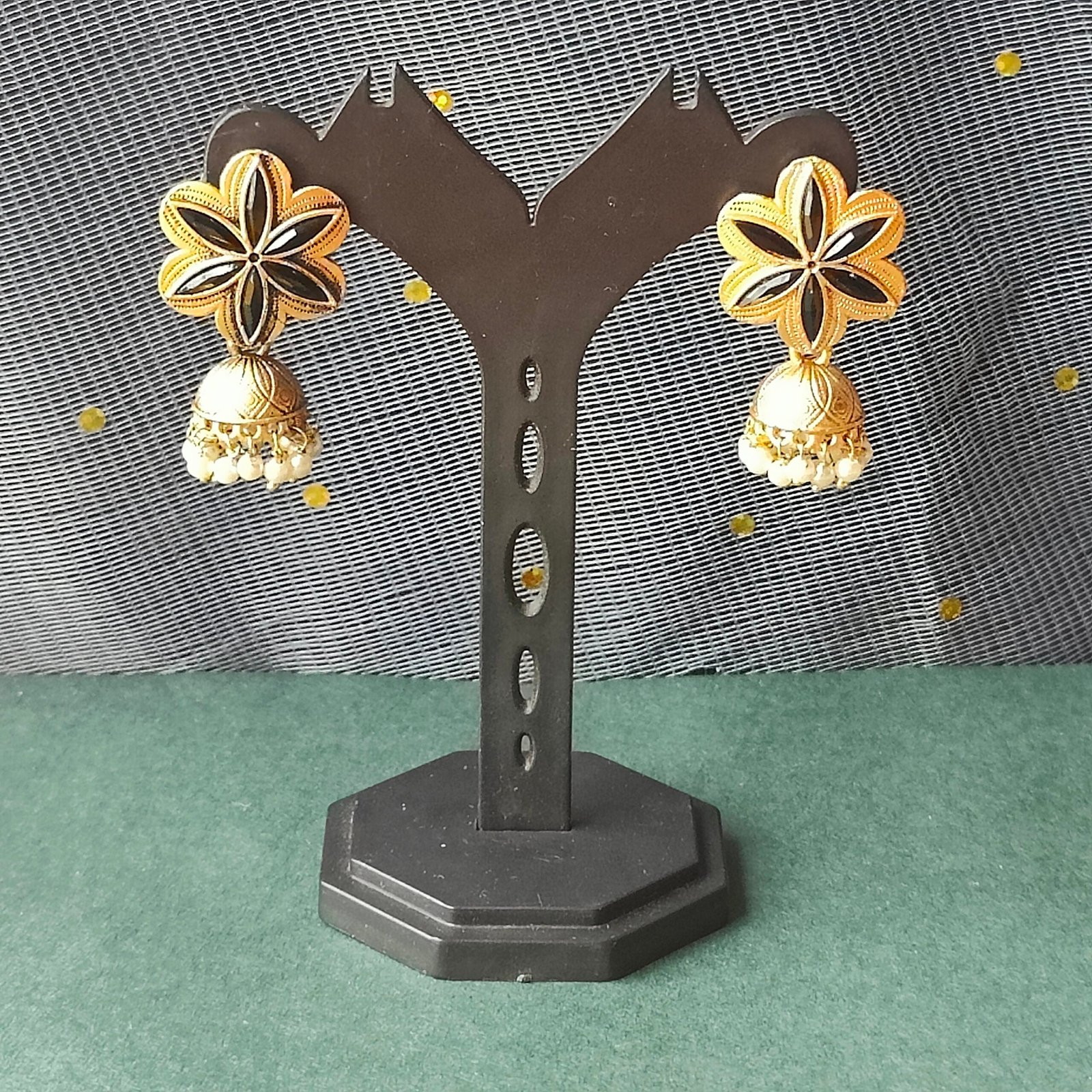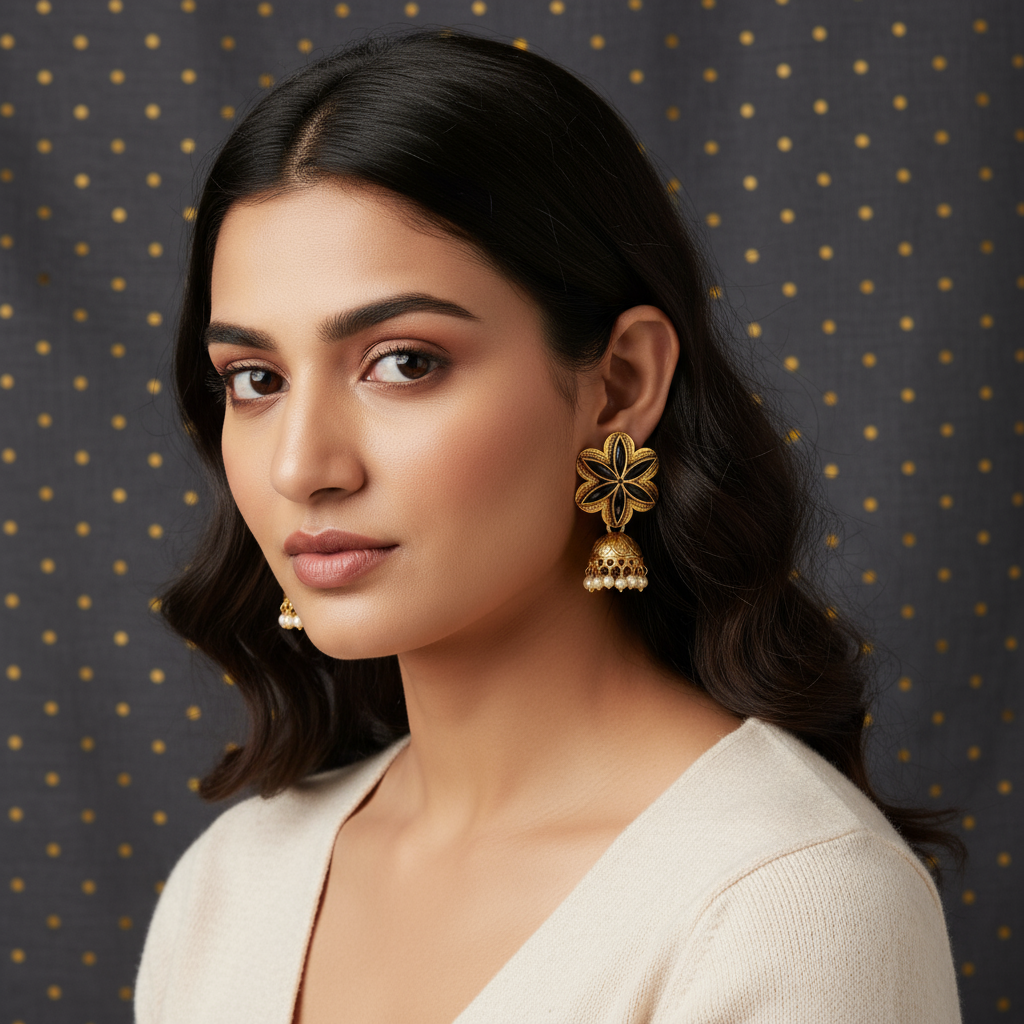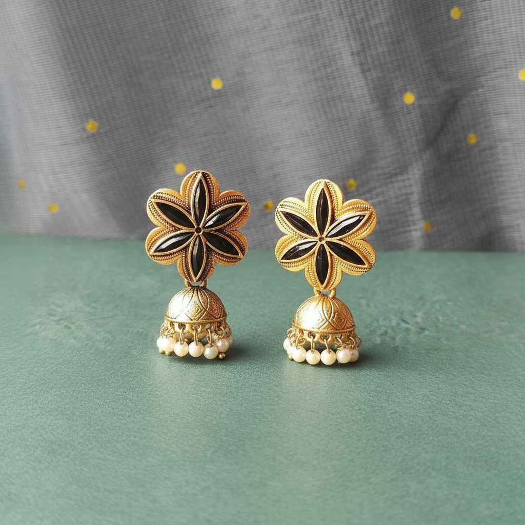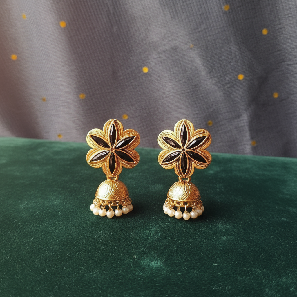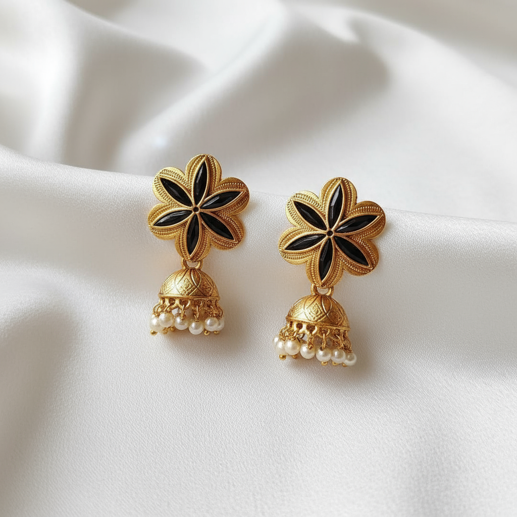 Enhance your ethnic elegance with these exquisite Gold Floral Black Enamel Jhumka Earrings, crafted to reflect timeless beauty and modern sophistication. The floral stud design features rich black enamel detailing, beautifully contrasted against a radiant gold finish. The intricately carved dome-shaped jhumka is adorned with soft white pearl drops that add graceful movement and classic charm.