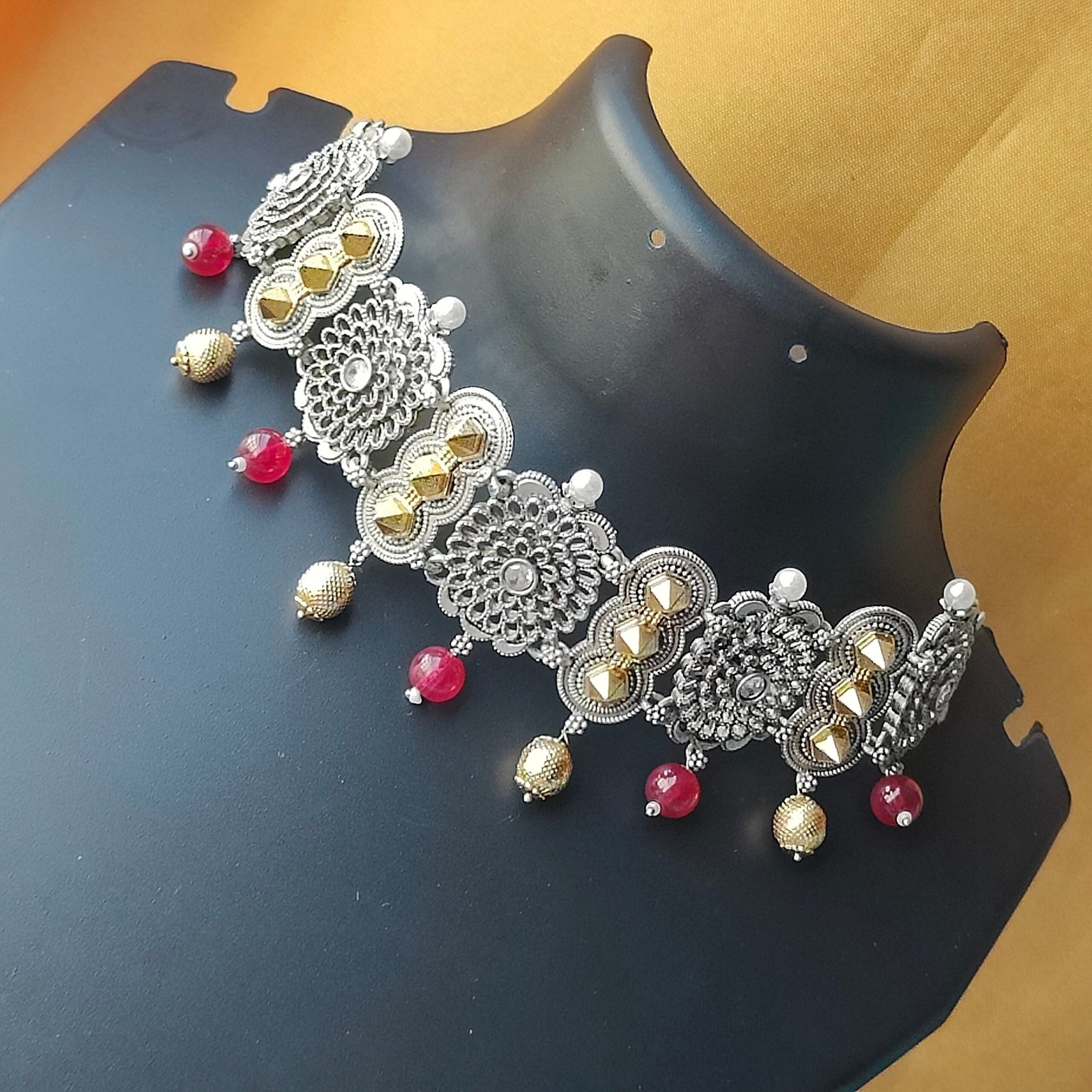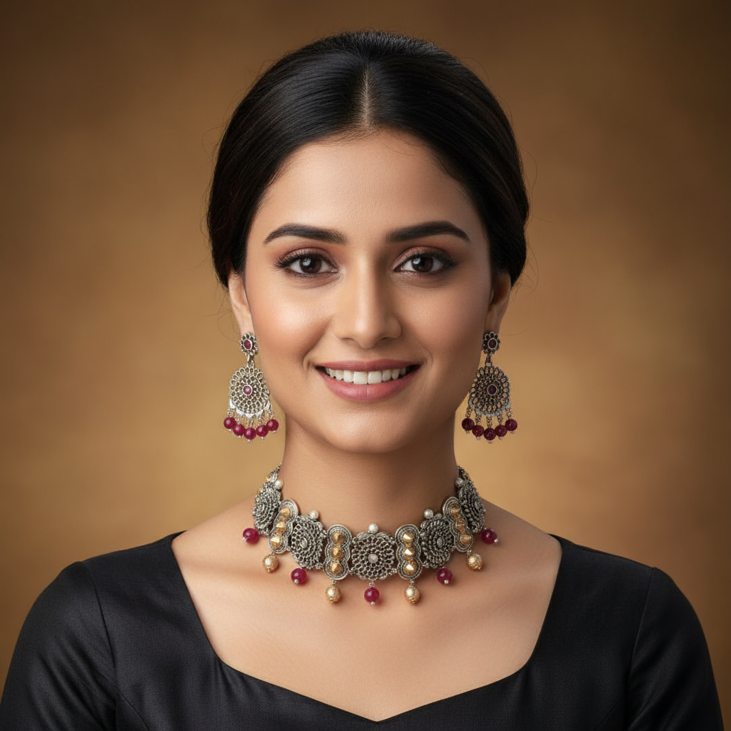Make a bold yet elegant statement with this beautifully designed oxidised silver choker necklace set. Crafted with intricate floral filigree motifs, the choker is enhanced with warm gold-tone highlights and finished with rich ruby-red bead drops that add graceful movement and depth. The matching chandelier-style earrings echo the same detailed craftsmanship, completing the set with perfect harmony. Ideal for weddings, festive celebrations, and special occasions, this choker set pairs effortlessly with sarees, lehengas, and ethnic ensembles for a refined traditional look.