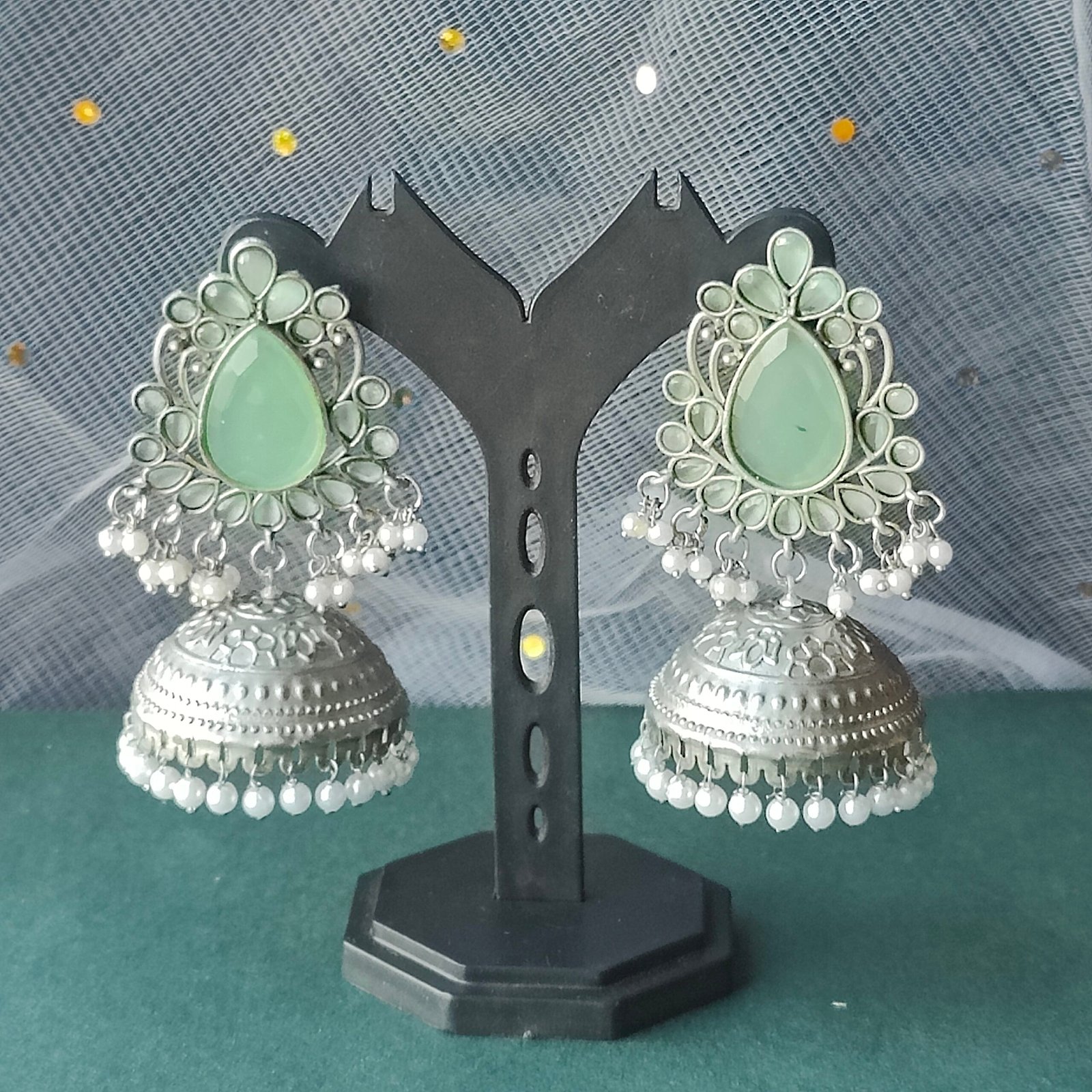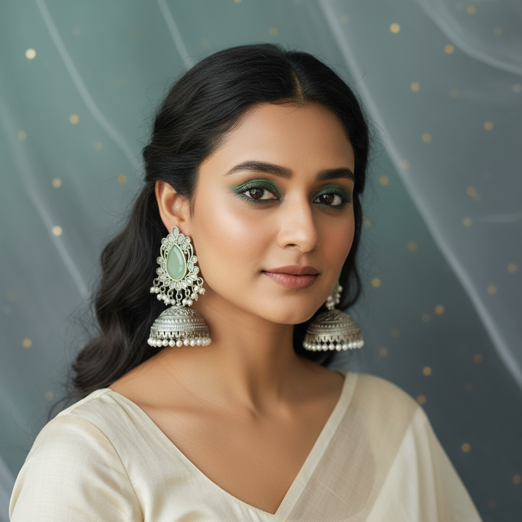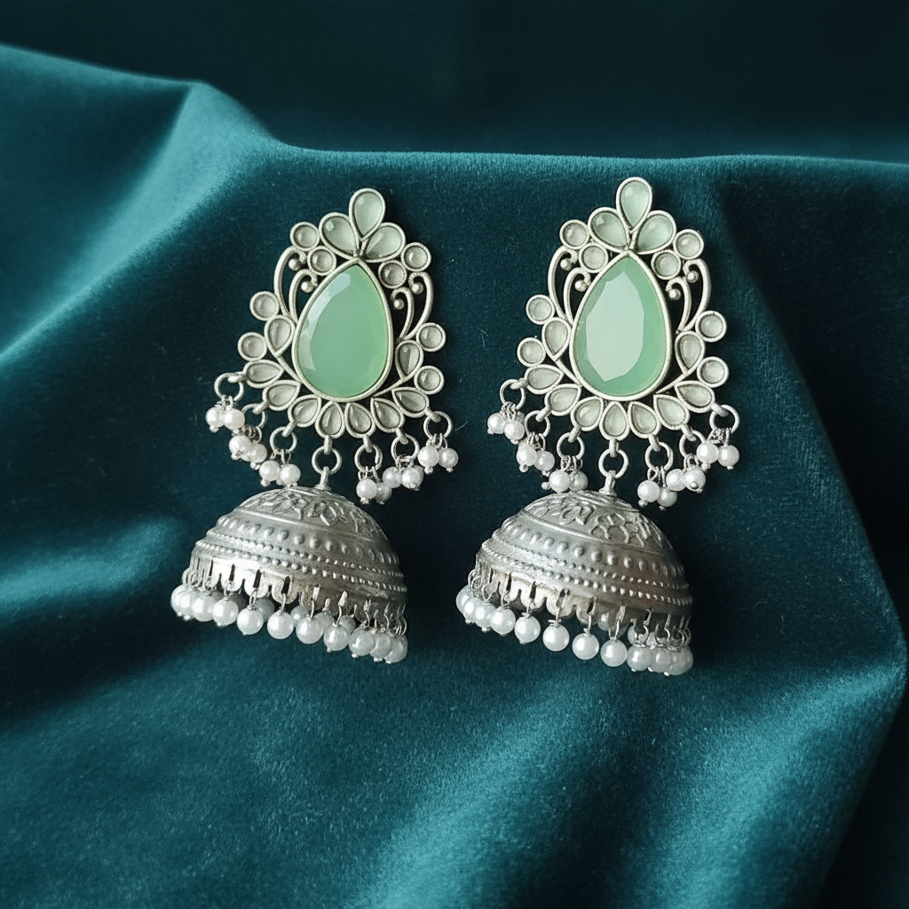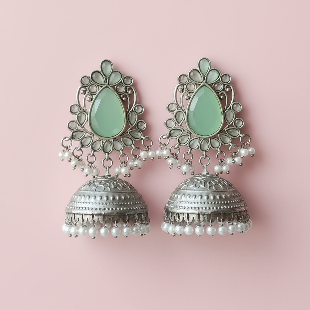 Add elegance to your ethnic look with these stunning pastel green kundan jhumka earrings. Crafted in oxidized silver with intricate floral motifs and finished with dainty pearls, these earrings combine traditional craftsmanship with contemporary style. The lightweight design ensures comfortable wear for long hours, making them perfect for festivals, weddings, parties, or everyday glamour. Pair these jhumkas with sarees, kurtis, or lehengas for a radiant and memorable statement.