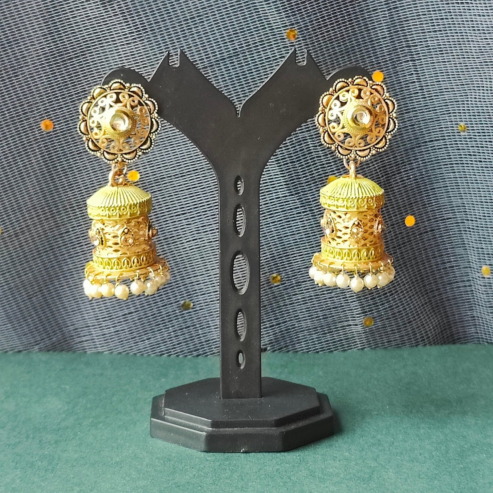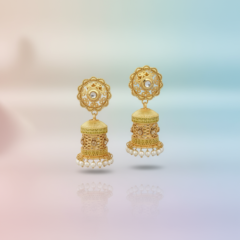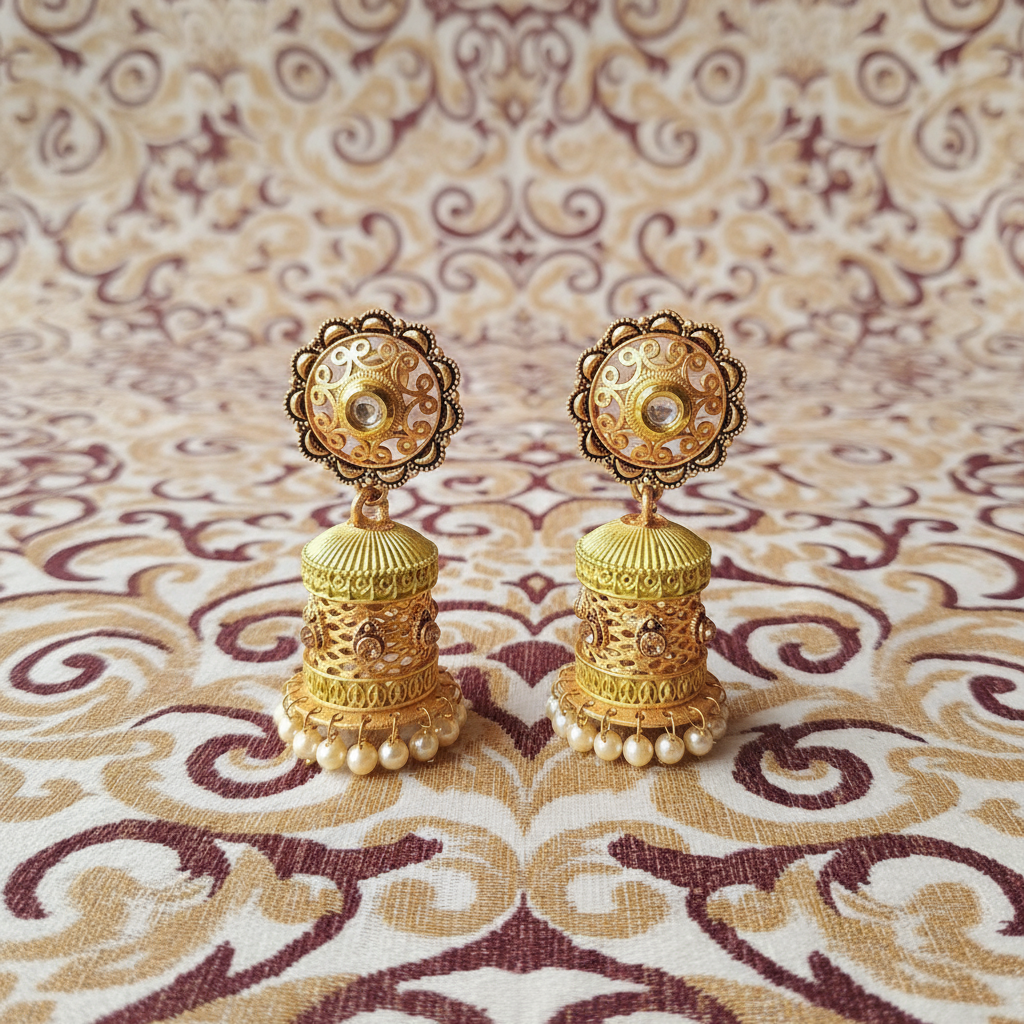 Elevate your traditional elegance with these exquisitely crafted antique gold jhumka earrings, designed to capture the richness of classic Indian artistry. The earrings feature a beautifully carved floral stud that flows into a cylindrical dome adorned with intricate filigree motifs and delicate embellishments. The lower rim is lined with lustrous pearl droplets, adding a graceful movement and timeless charm to the design. Perfect for weddings, festive occasions, and cultural celebrations, these earrings blend heritage craftsmanship with luxurious detailing, making them a standout accessory in any jewelry collection. Whether paired with sarees, lehengas, or Indo-fusion attire, they bring a regal touch to every ensemble.