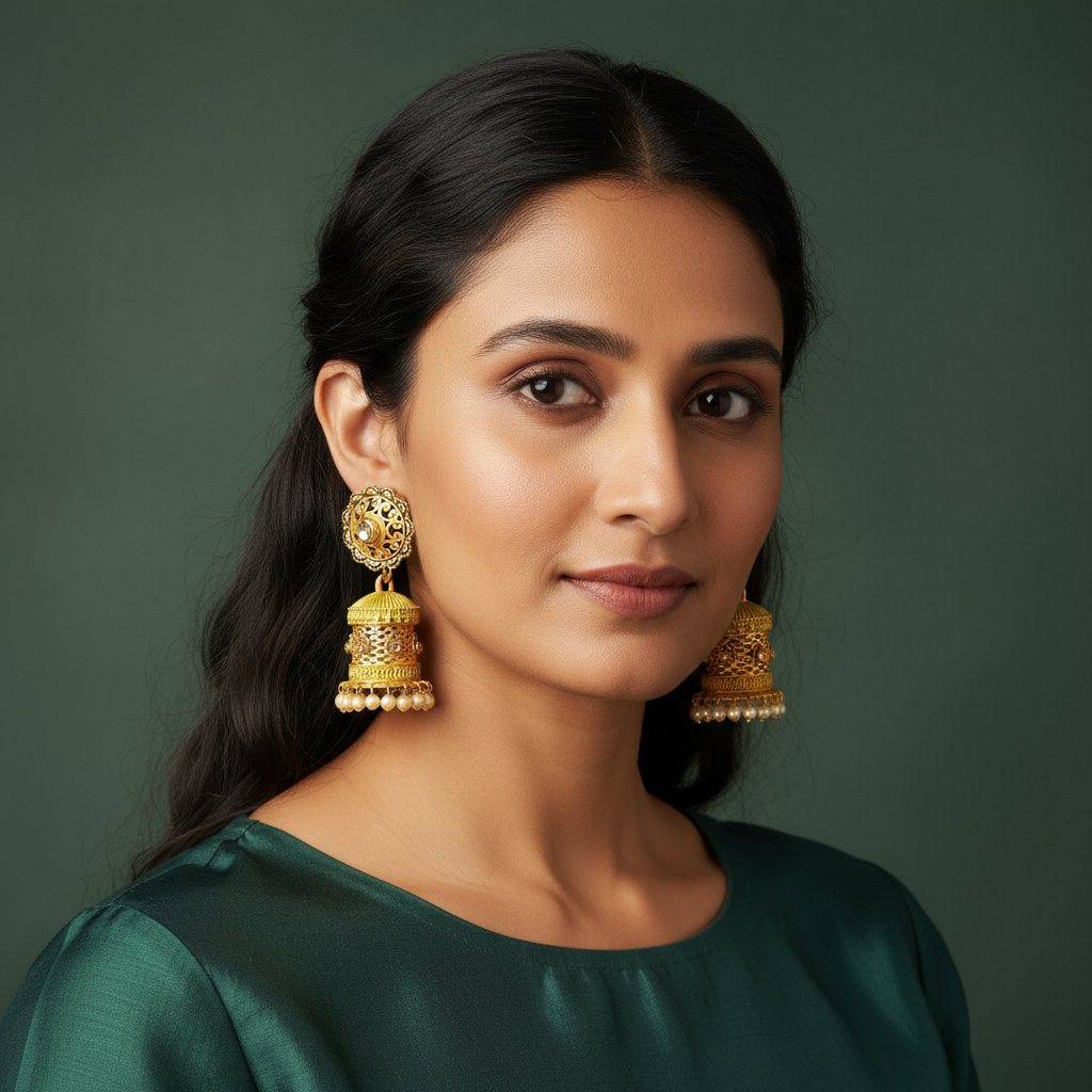 Be the first to review “Regal Antique Gold Jhumka Earrings with Intricate Filigree”