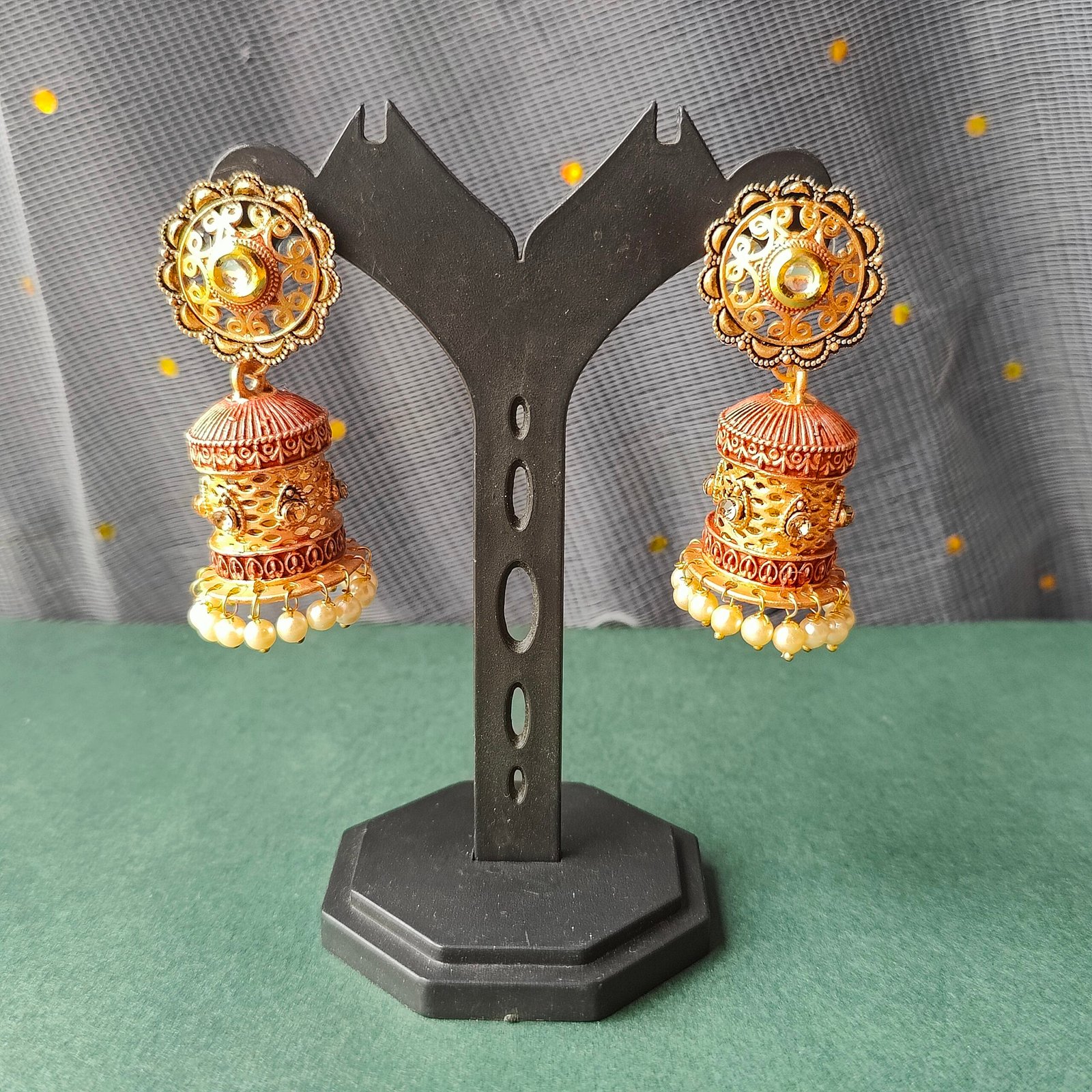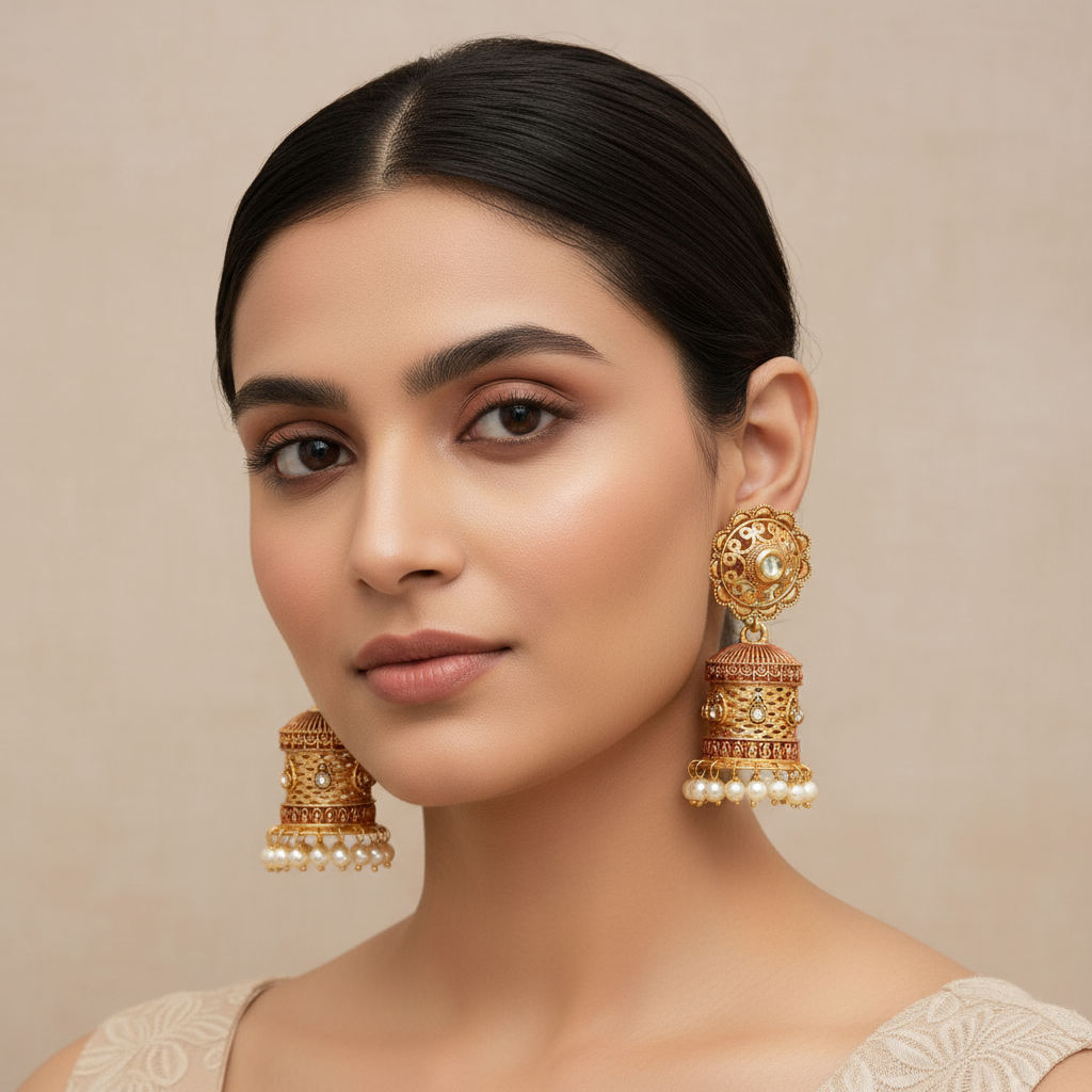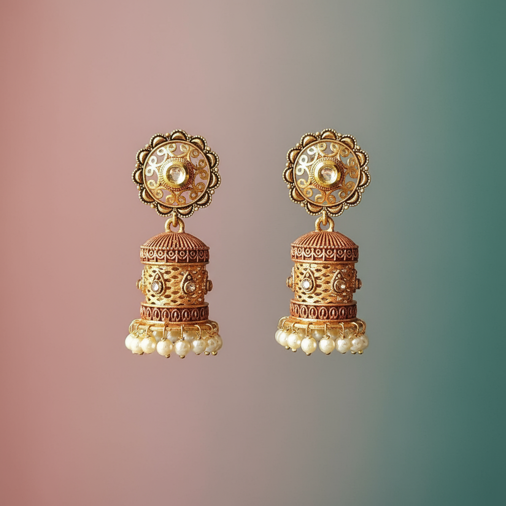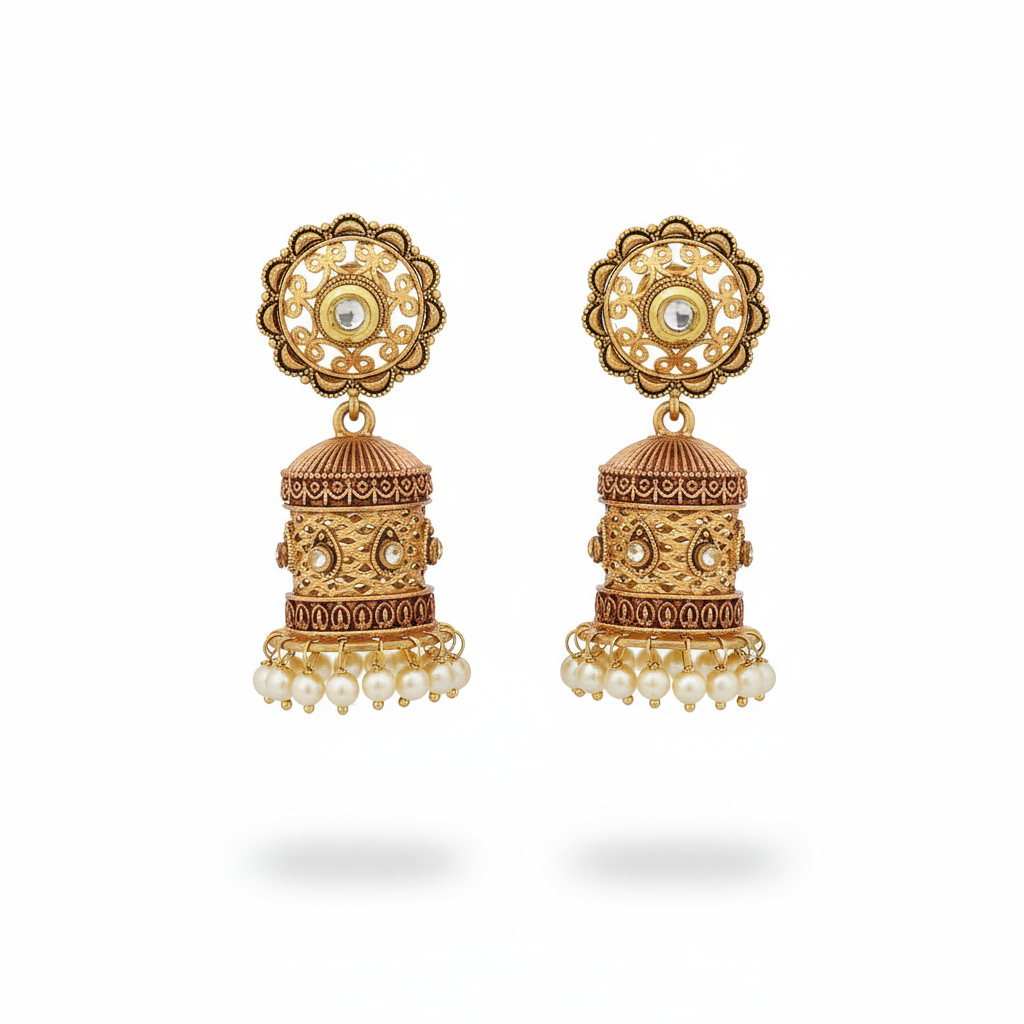 Elevate your traditional elegance with these exquisitely crafted antique gold jhumka earrings, designed to capture the richness of classic Indian artistry. The earrings feature a beautifully carved floral stud that flows into a cylindrical dome adorned with intricate filigree motifs and delicate embellishments. The lower rim is lined with lustrous pearl droplets, adding a graceful movement and timeless charm to the design. Perfect for weddings, festive occasions, and cultural celebrations, these earrings blend heritage craftsmanship with luxurious detailing, making them a standout accessory in any jewelry collection. Whether paired with sarees, lehengas, or Indo-fusion attire, they bring a regal touch to every ensemble.