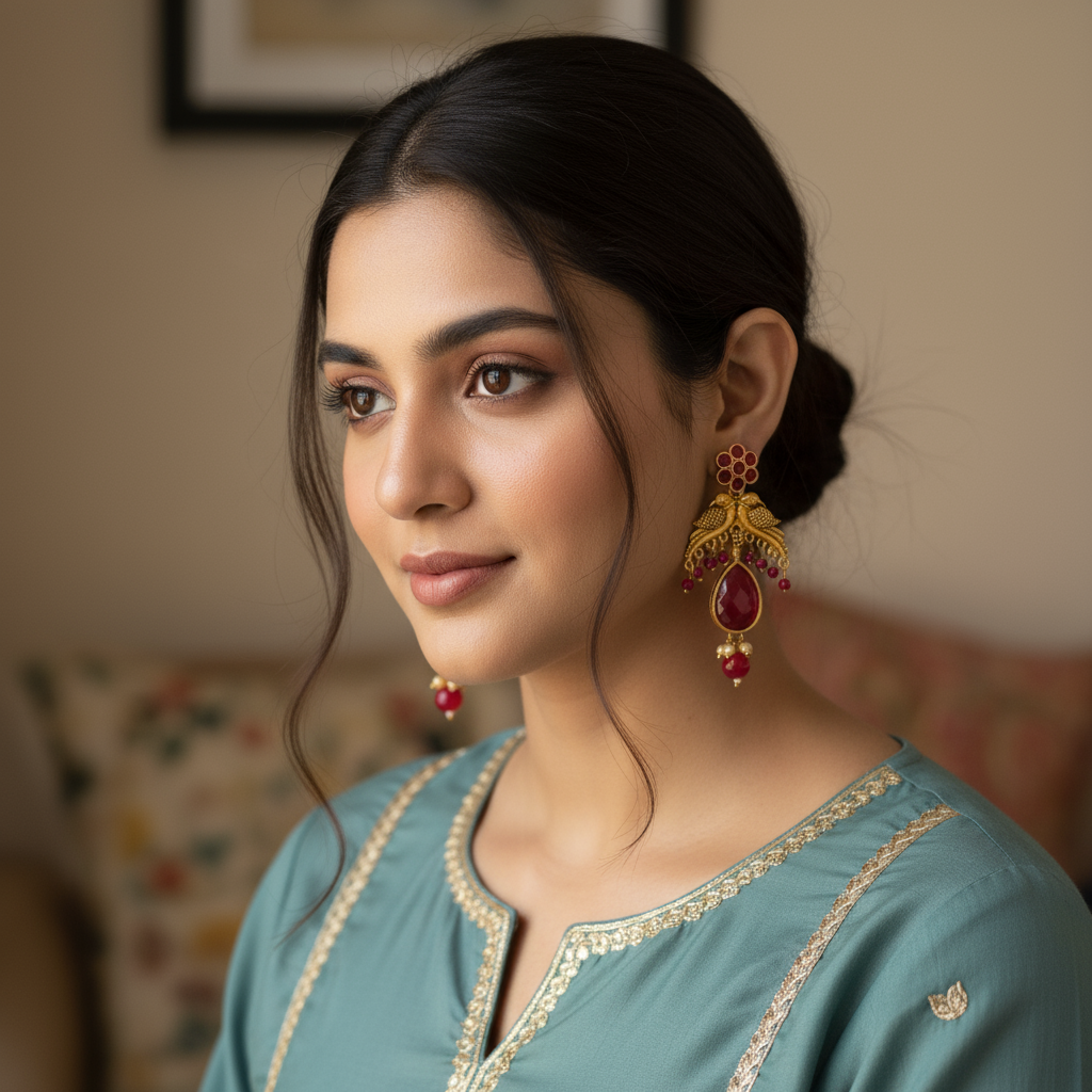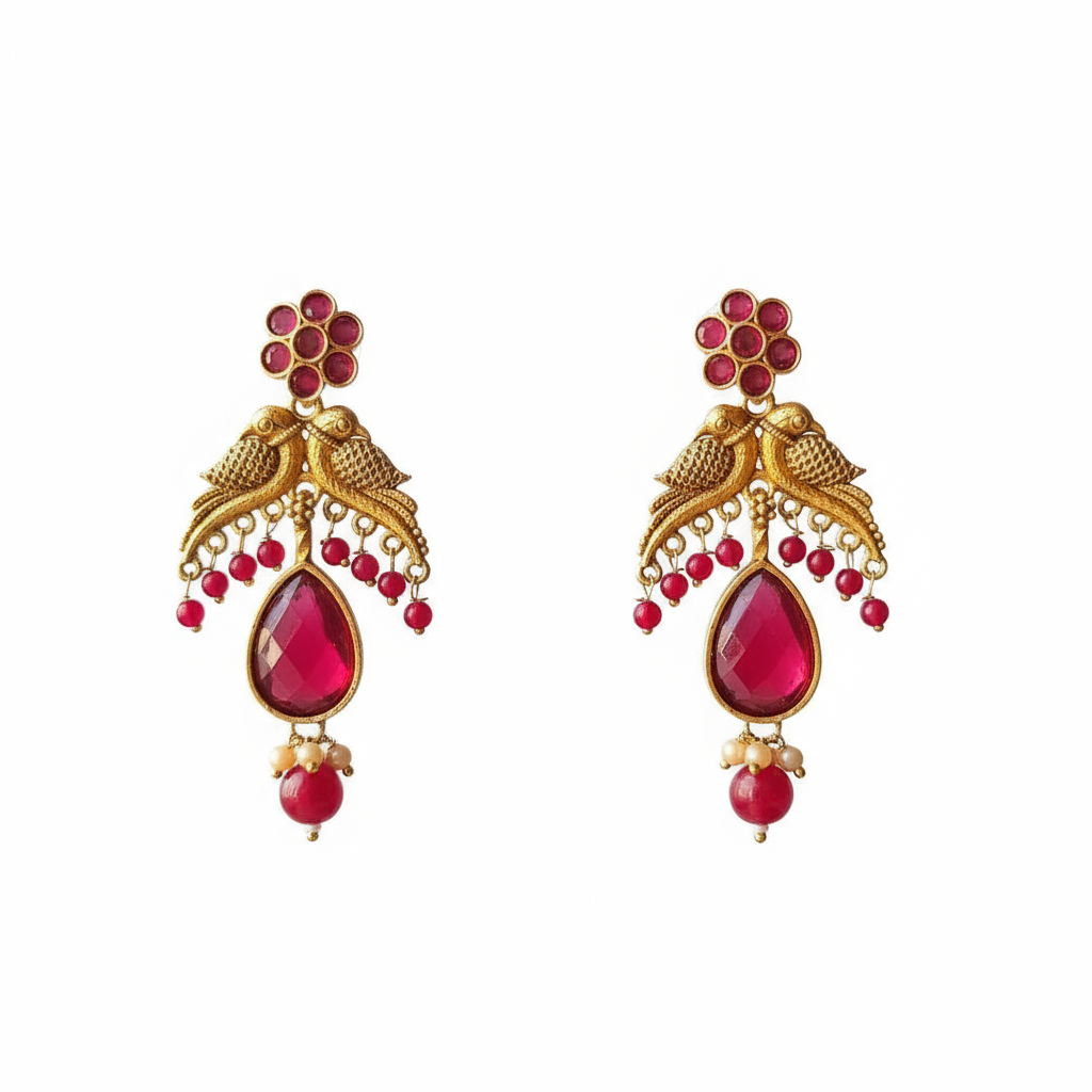 Experience timeless elegance with these exquisitely designed earrings featuring a captivating bird motif that symbolizes love, grace, and heritage. The floral stud adorned with ruby-toned stones sets a vibrant tone, leading to two beautifully sculpted birds perched gracefully atop a cascade of dangling red beads. At the center hangs a stunning teardrop-shaped ruby-red stone framed in antique gold, adding a rich, regal touch to the design. Finished with a delicate cluster of beads at the bottom, these earrings seamlessly blend traditional artistry with modern sophistication. Perfect for weddings, festive occasions, and ethnic celebrations, they pair effortlessly with sarees, lehengas, and contemporary indo-fusion wear.