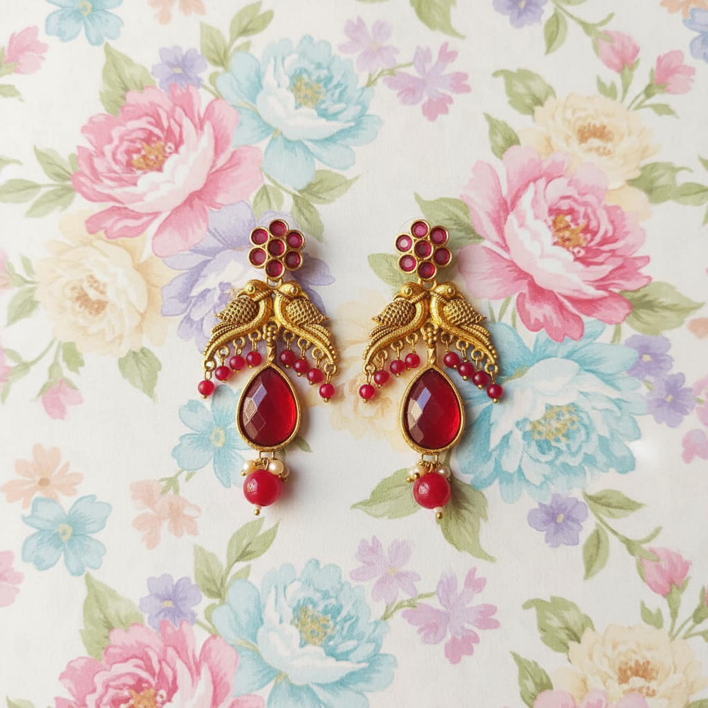 Royal Bird Motif Earrings with Ruby Red Stones & Antique Gold Detailing
