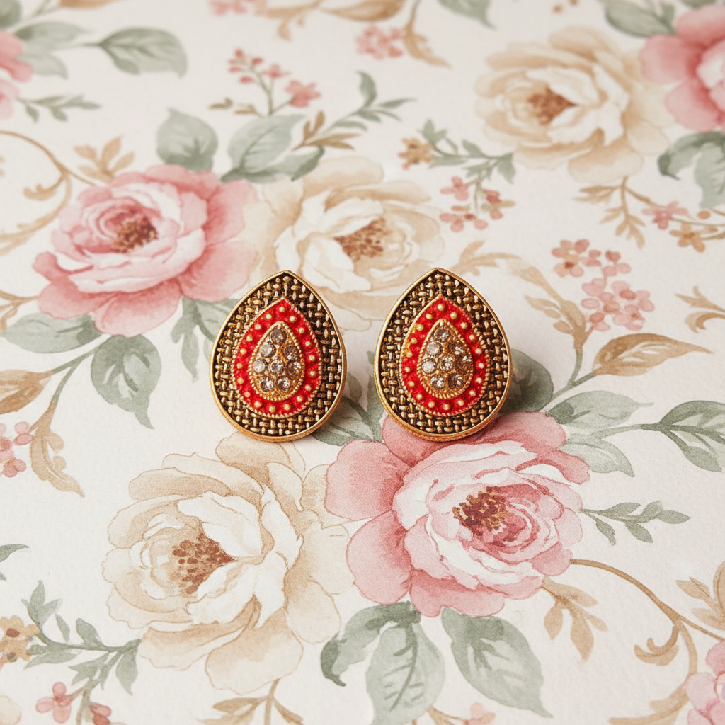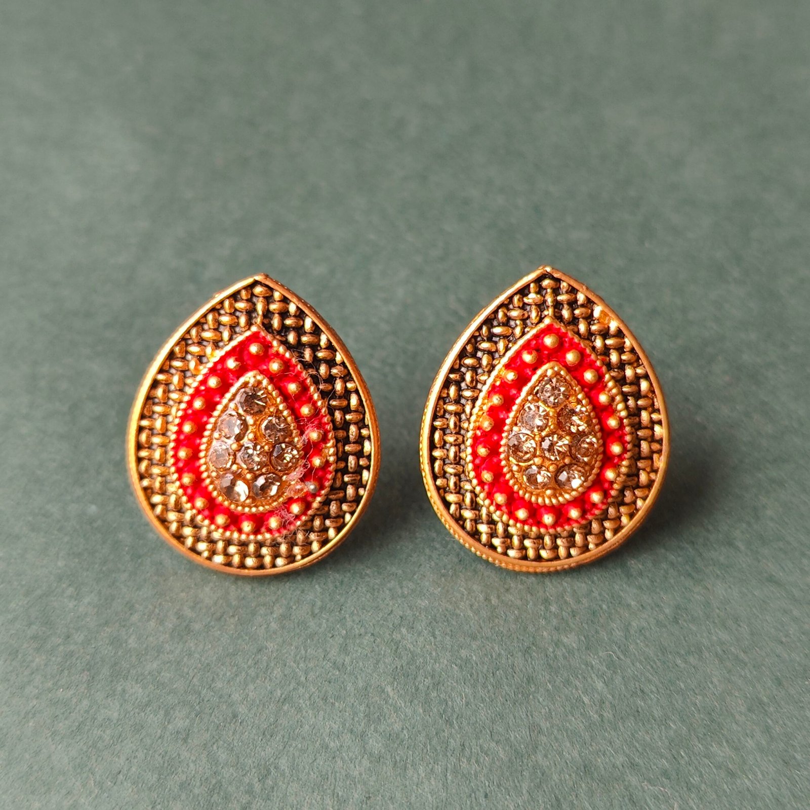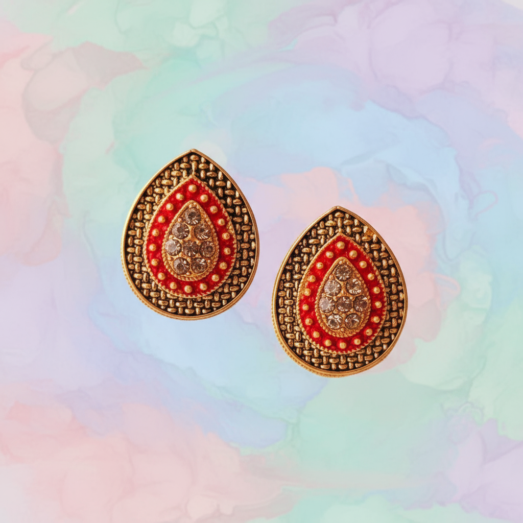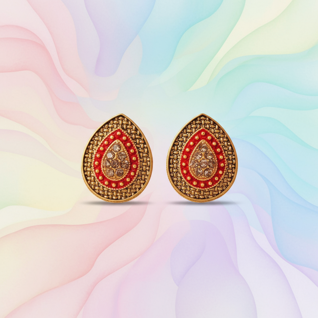 Add a touch of timeless elegance to your jewelry collection with these antique gold-plated teardrop stud earrings, beautifully accented with red enamel work and sparkling white stones. The classic teardrop design is enriched with intricate patterns that reflect fine craftsmanship and ethnic charm.