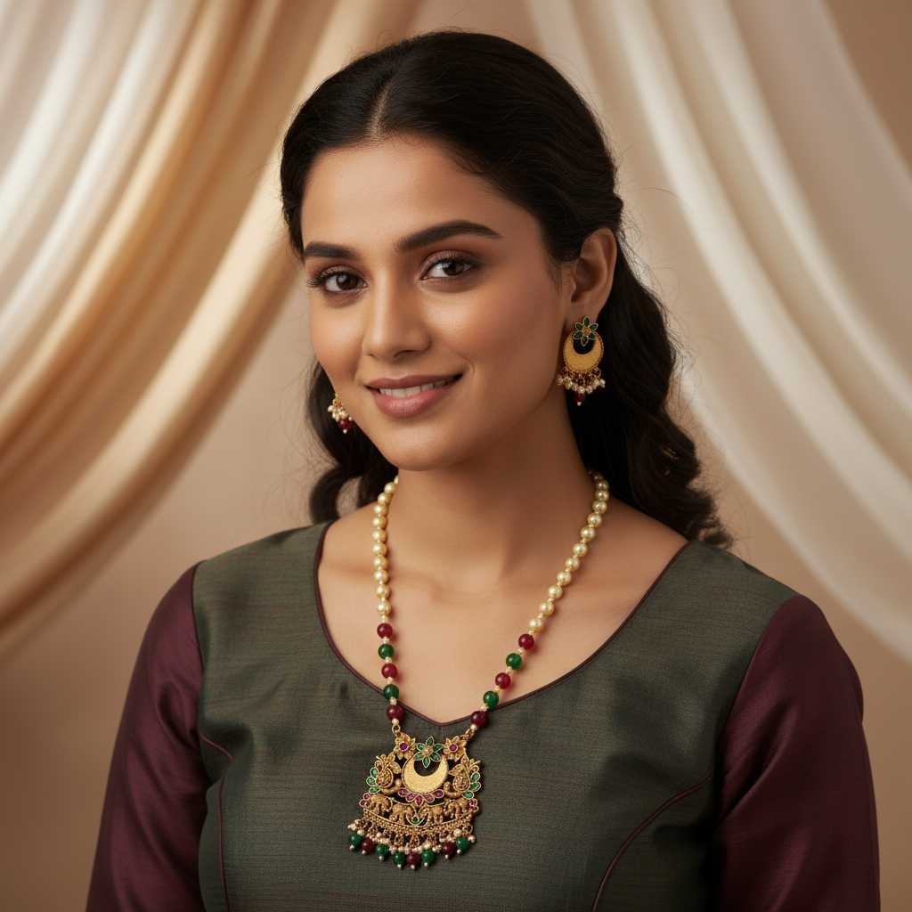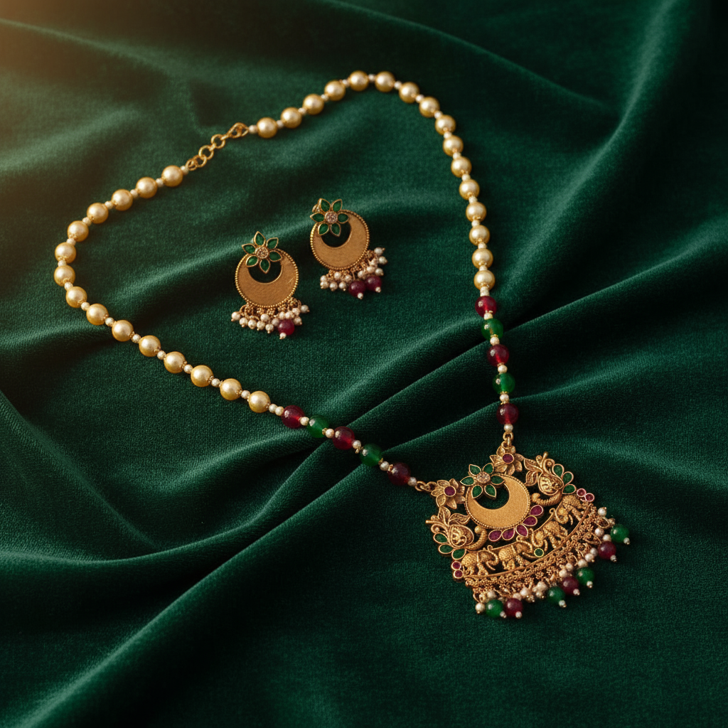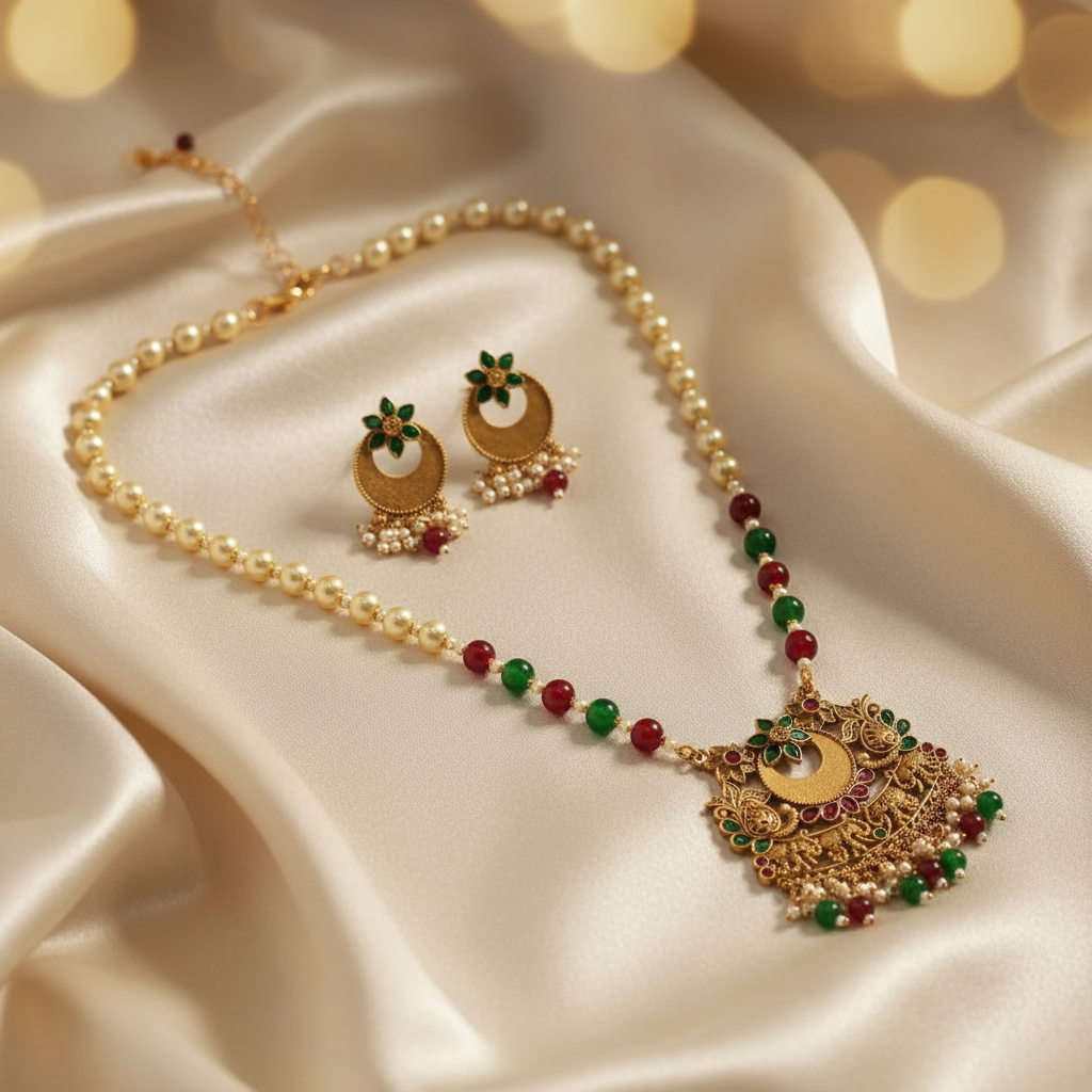 Enhance your ethnic jewellery collection with this beautifully crafted antique gold necklace set, designed to reflect timeless traditional elegance. The necklace features a graceful pearl-beaded chain highlighted with alternating ruby and green beads, leading to an intricately detailed antique gold pendant adorned with floral motifs and enamel accents. Finished with delicate pearl and bead danglers, the pendant adds richness and movement to the design. Paired with matching earrings, this set is perfect for weddings, festive celebrations, poojas, and cultural occasions, complementing sarees and ethnic outfits effortlessly.