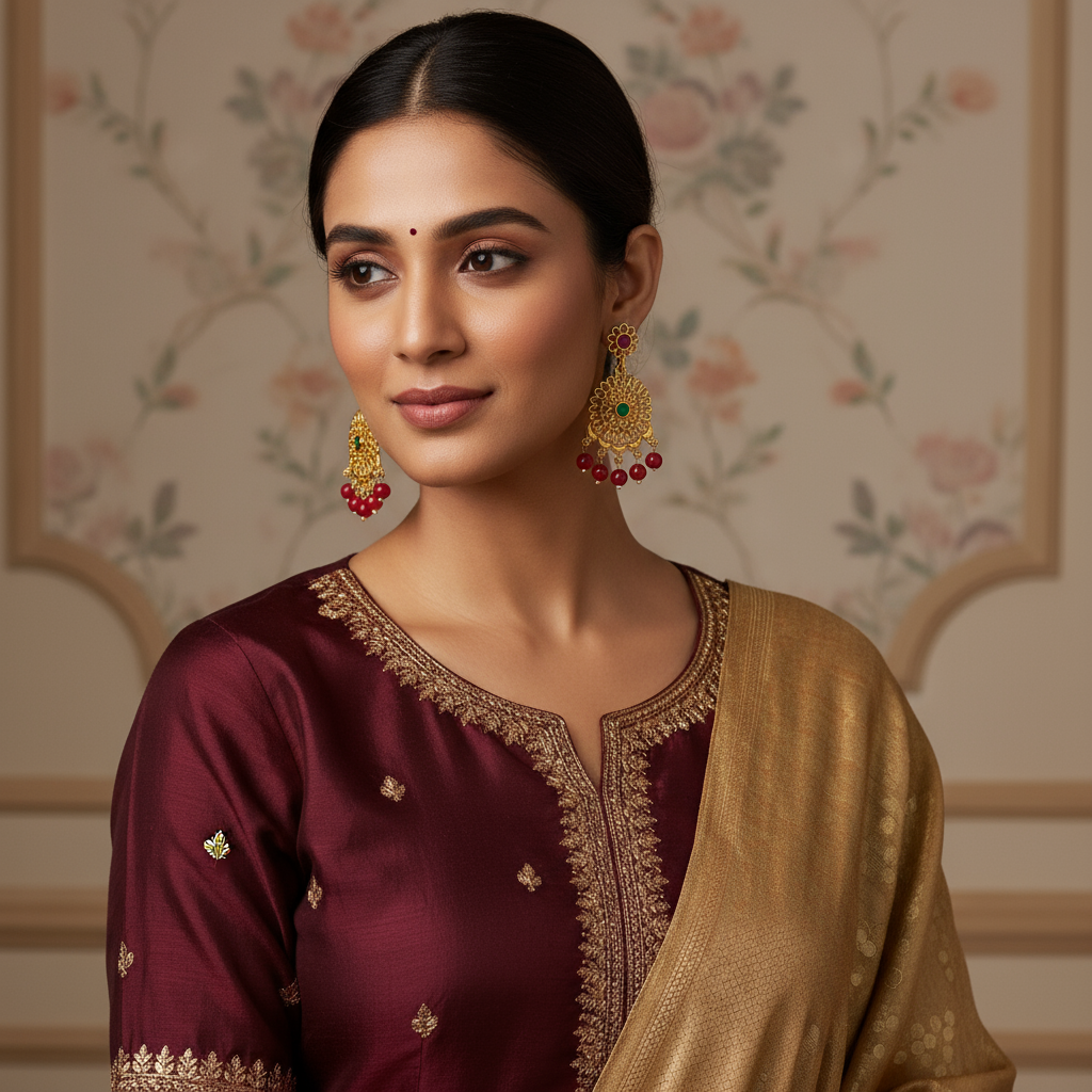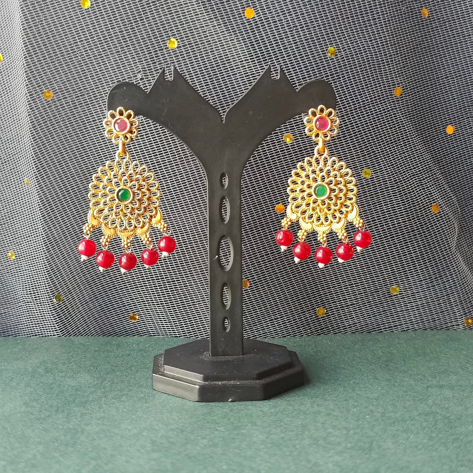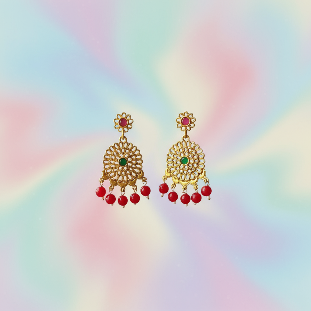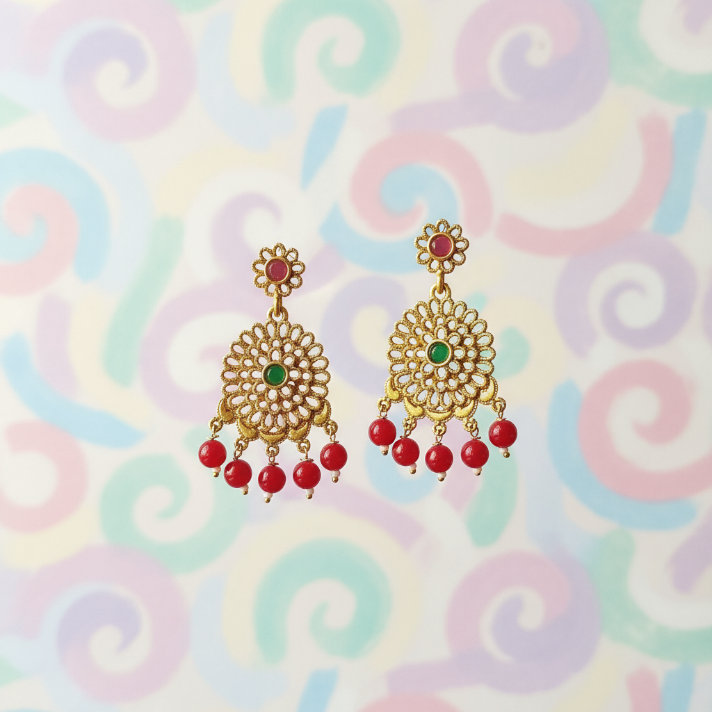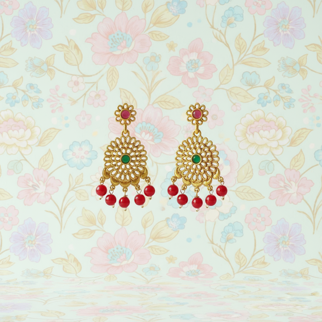 Add a vibrant touch of tradition to your ethnic wardrobe with these beautifully designed gold-tone filigree earrings. Featuring an intricate floral lattice pattern, the earrings are highlighted with classic red and green stones at the center, symbolising elegance and festive charm. The dangling red bead drops add graceful movement, making these earrings perfect for weddings, festivals, poojas, and special occasions. Crafted to balance richness with comfort, they pair effortlessly with sarees, lehengas, and anarkalis for a timeless traditional look.